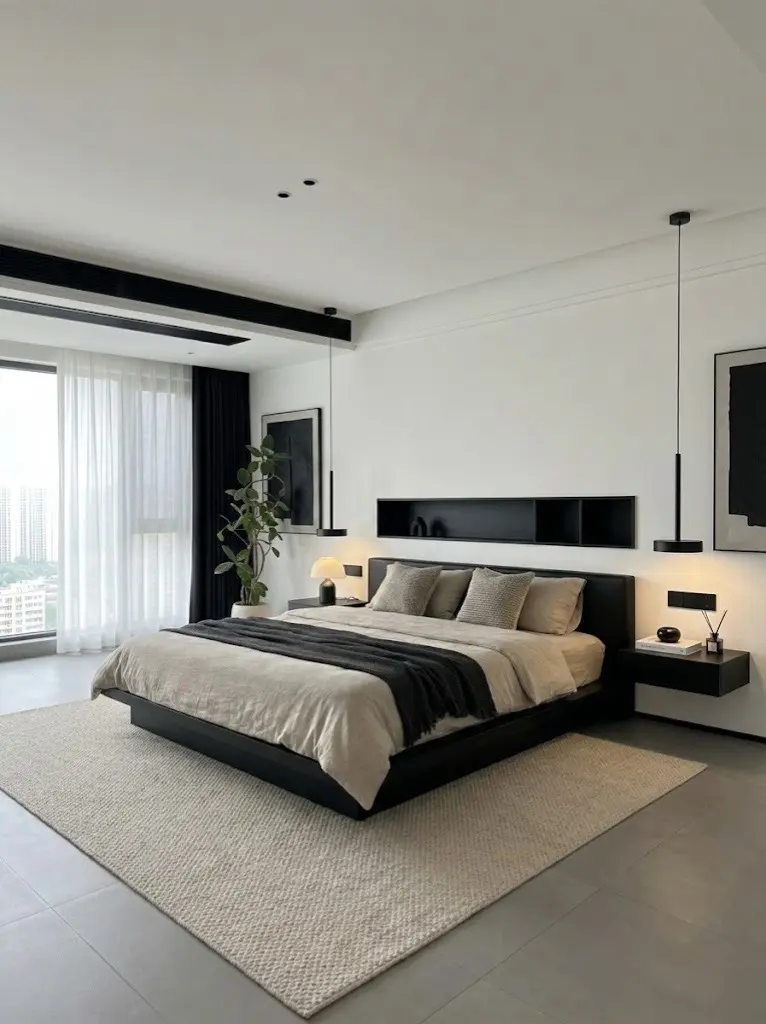 为了中和黑白调的冷峻,我们在软装上做足了“加法”。米灰色的颗粒感编织地毯、柔软的千鸟格抱枕以及温润的布艺沙发,为空间注入了细腻的触感与温度。卧室延续了静谧的基调,内嵌式收纳壁龛取代了传统的床头柜,将功能隐匿于无形。