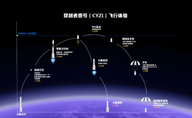 据穿越者此前介绍,穿越者壹号(CYZ1)可将乘客运送至距离地面高度100km的卡门线,体验3-6分钟的失重。