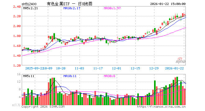 1月22日,有色金属ETF(512400)跌0.75%,成交额18.88亿元。当日份额增加4.11亿份,最新份额为163.41亿份,近20个交易日份额增加63.60亿份。最新资产净值计算值为364.33亿元。