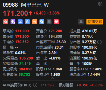 1月23日消息,阿里巴巴-W(9988.HK)高开3.88%报171.2港元,成交额逾8亿港元。隔夜美股市场阿里巴巴收涨5%报177.18美元。