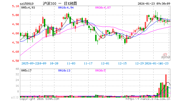 1月23日,沪深300ETF(159919)开盘涨0.06%,报4.929元。沪深300ETF(159919)重仓股方面,宁德时代开盘涨0.64%,贵州茅台涨0.00%,中国平安涨0.62%,中际旭创跌1.13%,紫金矿业涨1.94%,招商银行涨0.00%,新易盛跌0.94%,美的集团涨0.10%,兴业银行涨0.10%,长江电力涨0.19%。