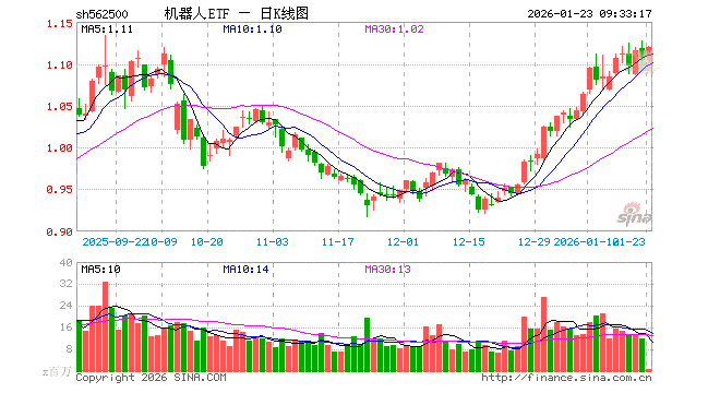 1月23日,机器人ETF(562500)开盘涨0.09%,报1.116元。机器人ETF(562500)重仓股方面,科大讯飞开盘涨0.96%,汇川技术涨0.29%,拓普集团涨0.56%,大华股份涨0.00%,大族激光涨1.17%,双环传动跌0.30%,石头科技涨0.35%,中控技术跌0.16%,绿的谐波跌0.09%,机器人涨0.44%。