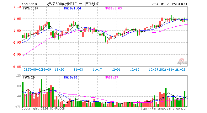 1月23日,沪深300成长ETF(562310)开盘涨0.00%,报1.043元。沪深300成长ETF(562310)重仓股方面,宁德时代开盘涨0.64%,贵州茅台涨0.00%,中际旭创跌1.13%,紫金矿业涨1.94%,新易盛跌0.94%,立讯精密涨0.39%,寒武纪跌1.18%,恒瑞医药涨0.49%,比亚迪涨0.13%,阳光电源涨0.38%。