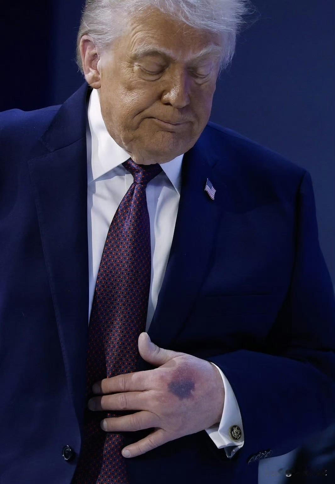 记者:“我们看到了你手上的淤青。 你没事吧? ” 特朗普:“我手上的淤青是在桌上磕了一下。不过也怪我,因为一直吃着大剂量阿司匹林来保护心脏,医生说很容易淤青,他劝我停药,但我不想冒险,这点副作用我认了。” 桌子上磕了一下这句话实在多余,总不能天天磕桌子吧,不过老盯着人家手上那块淤青也实在很无聊,他多数时候还是很注意的,比如坐着的时候都是用另一只手有意盖住手背上上的淤青,但也避免不了某些场合无法掩盖,除非打上手套。