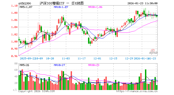 1月23日,截止午间收盘,沪深300增强ETF(561990)跌0.28%,报1.068元,成交额1508.90万元。沪深300增强ETF(561990)重仓股方面,宁德时代截止午盘跌0.36%,中际旭创跌6.10%,中国平安跌0.35%,紫金矿业涨1.01%,贵州茅台涨0.14%,兴业银行跌0.10%,新易盛跌6.71%,药明康德涨0.19%,农业银行跌0.29%,江苏银行跌0.81%。