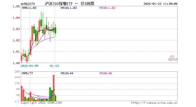 1月23日,截止午间收盘,沪深300指增ETF(562070)跌0.48%,报1.026元,成交额3801.58万元。沪深300指增ETF(562070)重仓股方面,宁德时代截止午盘跌0.36%,贵州茅台涨0.14%,中国平安跌0.35%,紫金矿业涨1.01%,招商银行涨0.00%,兴业银行跌0.10%,中际旭创跌6.10%,新易盛跌6.71%,寒武纪跌1.77%,药明康德涨0.19%。