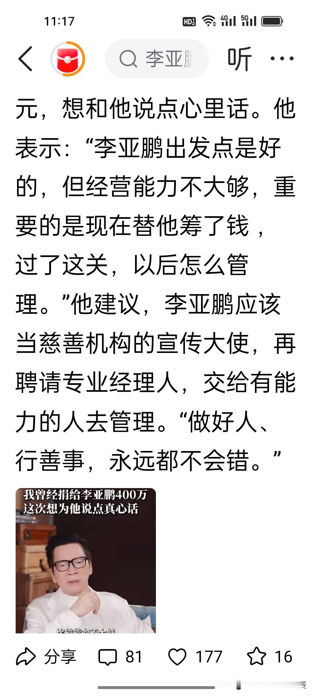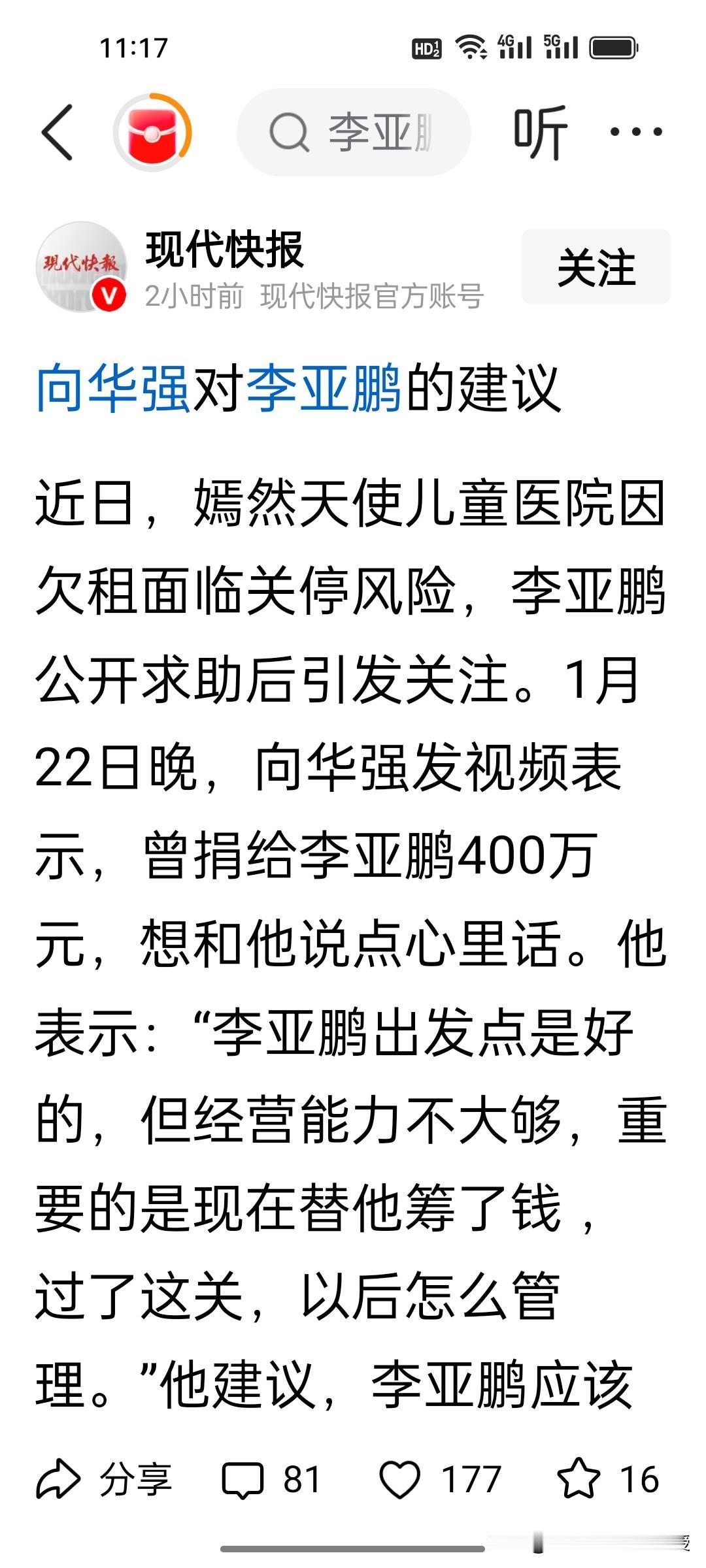 向华强对李亚鹏表示担忧,给他提了一个重要建议。 向华强直言,自己之前给嫣然天使儿童医院捐了400万,李亚鹏出发点是好的,但是经营能力不够,担心就算过了这一关,以后怎么管理。建议李亚鹏找个有能力的职业经理人,自己当宣传大使就行。 向华强的这番真心话不无道理,可以说是真心劝诫,要发挥自己的长板,让专业的人去管理,自己只做大方向上的战略,可以省心且更专注,还能让这份公益事业再上一层楼。