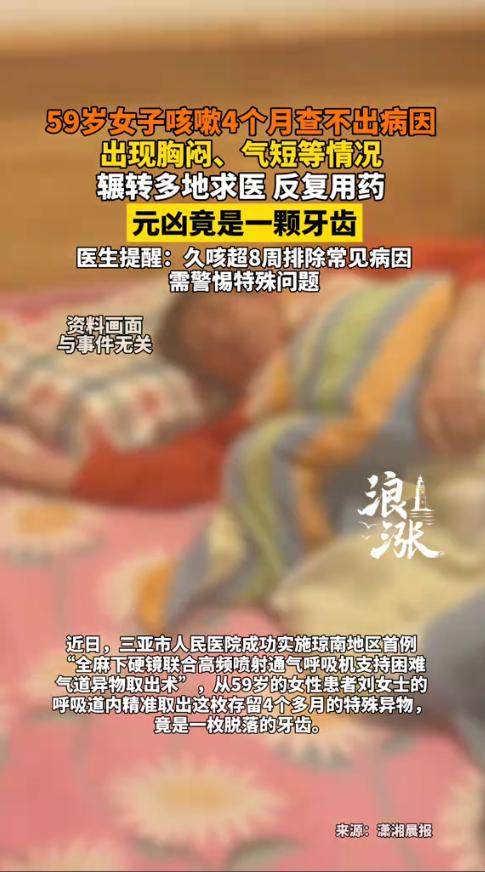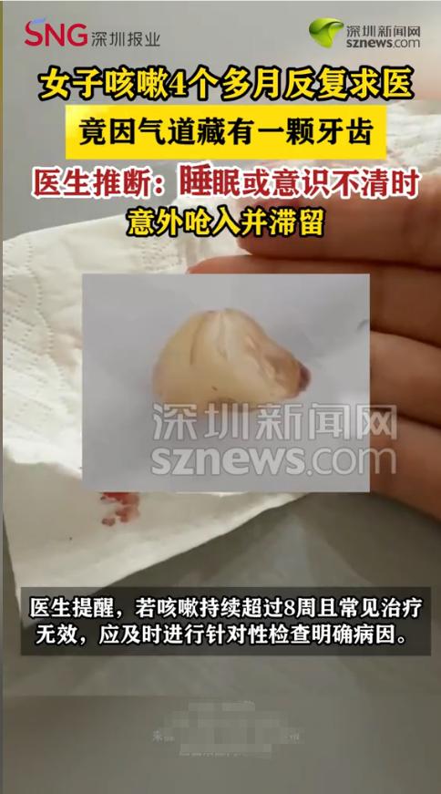 “太可怕了!”近日,海南,一59岁女子被咳嗽缠了4个多月,日夜咳得撕心裂肺,睡不好、吃不下,反复跑医院拍胸片、验血、吃遍止咳药,病因始终成谜。直到做气道探查,才发现折磨她数月的“隐形元凶”!网友:怎么进去的? 都说咳嗽是常见的小毛病,感冒、咽炎、肺部不适都可能引发,但并不是所有咳嗽都那么简单,有些看似普通的症状,背后可能藏着意想不到的异物。 据媒体1月22日报道,四个月前女子开始出现咳嗽的症状,开始以为自己是感冒,只是到诊所拿了点药。但是半个月后一直不见好转,还是反复咳嗽,甚至开始影响到了吃饭和睡觉,于是她便前往医院进行检查,可无论是拍胸片、做血常规、还是吃止咳药和消炎药,能试的方法都试了,咳嗽还是时好时坏,一直不见好转。 直到最后一次就医时,医生建议做更细致的气道探查。这才发现她的气道里有一枚异物,取出来一看,竟是一颗完整的脱落牙齿!女子很是纳闷,这究竟是怎么进去的,自己怎么一点印象没有? 医生推断,这颗牙大概率是她在睡眠或意识不清时,意外呛入气道并滞留其中,长期刺激气道黏膜,才导致了持续4个多月的咳嗽。 网友看后表示,太不可思议了,咳嗽4个月竟是一颗牙搞的鬼,有人表示,这谁能想到,睡个觉,牙还能呛进气道里,以后可要注意了。 信息来源:《59岁女子咳嗽4个月查不出病因出现胸闷、气短等情况辗转多地求医反复用药元凶竟是一颗牙齿》浪涨新闻