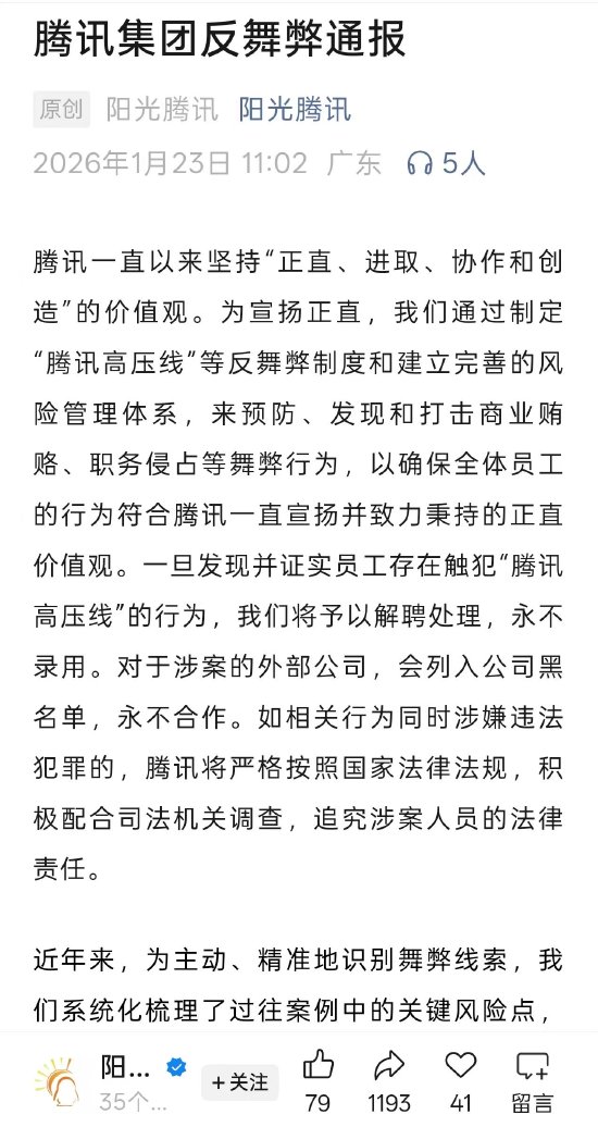 新浪科技讯1月23日午间消息,今日,腾讯官方账号“阳光腾讯”公布2025年反舞弊进展。官方表示2025全年,腾讯反舞弊调查部共发现并查处触犯“腾讯高压线”案件七十余起,九十余人因触犯“腾讯高压线”被解聘,其中二十余人因涉嫌犯罪被移送公安机关处理,三十余名涉案的外部人员也被公安机关一并抓捕。