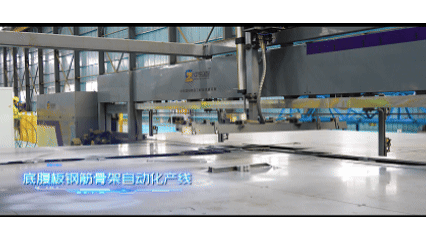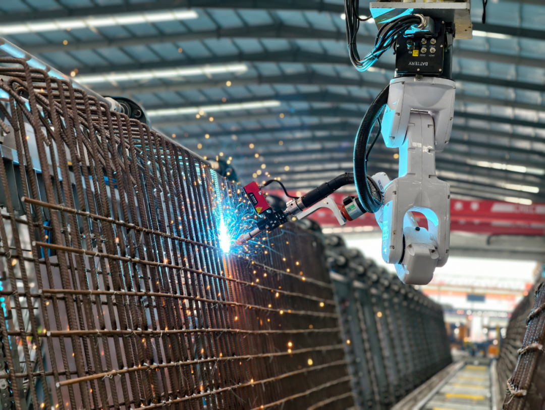 随后,焊接机器人自动识别位置,完成顶板与底腹板钢筋的焊接,钢筋骨架便成型了。
