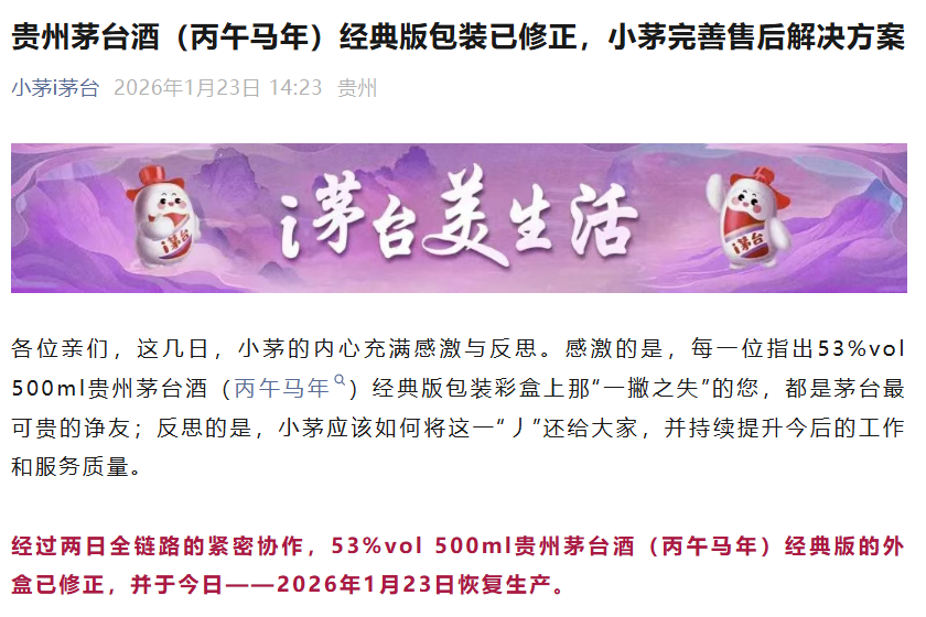 1月23日,i茅台就53%vol500ml贵州茅台酒(丙午马年)经典版包装盒误将“昴”写成“昂”的问题进一步予以回应称,经全链路紧急协作,修正后的外盒已于当日恢复生产。