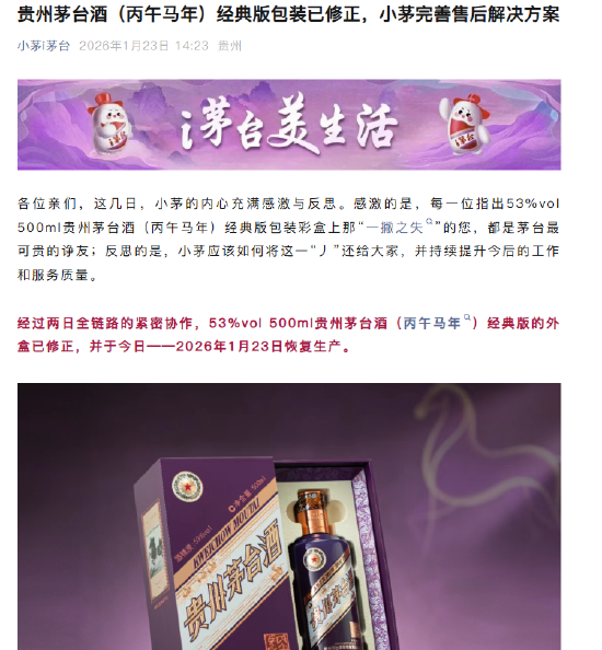 1月23日,“小茅i茅台”微信公众号发文表示,经过两日全链路的紧密协作,53%vol500ml贵州茅台酒(丙午马年)经典版的外盒已修正,并于今日——2026年1月23日恢复生产。