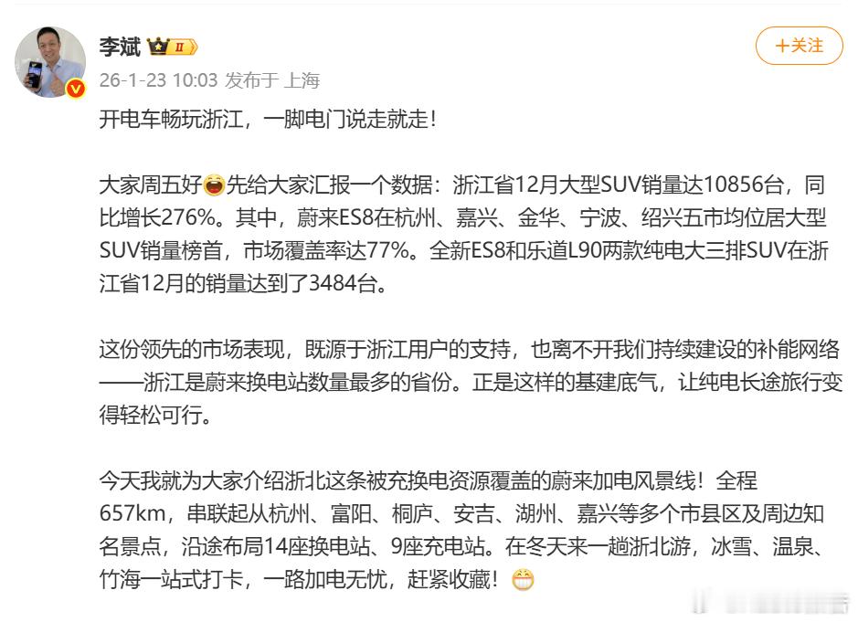 蔚来ES8拿下浙江五市大型SUV销冠1月23日,蔚来李斌发布,蔚来车型在浙江市场的销量表现,数据显示,浙江省12月大型SUV销量达10856台,同比增长276%,其中,蔚来ES8在杭州、嘉兴、金华、宁波、绍兴五市均位居大型SUV销量榜首,市场覆盖率达77%。全新ES8和乐道L90两款纯电大三排SUV在浙江省12月的销量达到了3484台。汽场全开蔚来蔚来es8乐道l90