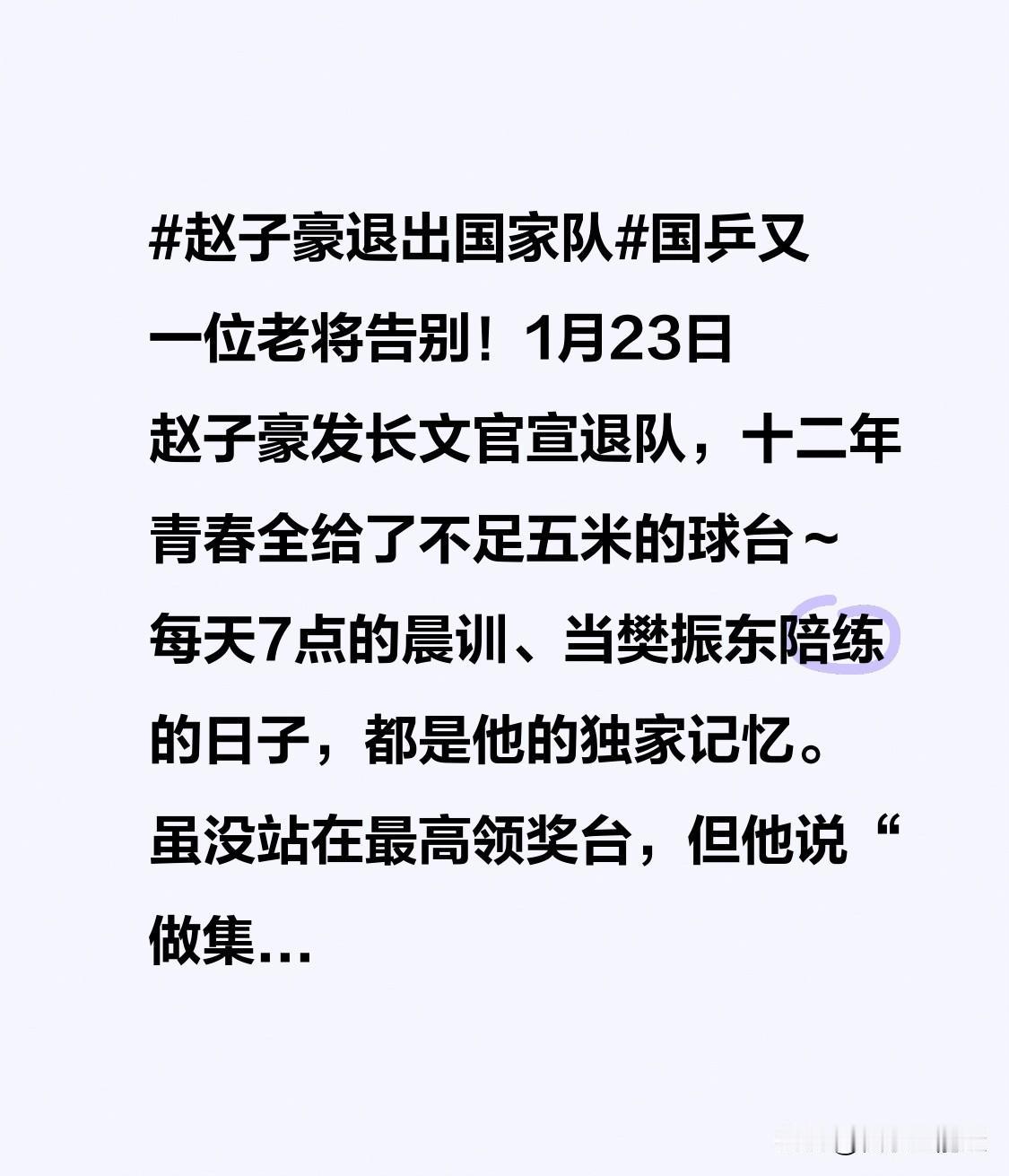 国乒又一位老将告别!1月23日赵子豪发长文官宣退队,十二年青春全给了不足五米的球台~ 每天7点的晨训、当樊振东陪练的日子,都是他的独家记忆。 虽没站在最高领奖台,但他说“做集体的拼图也是英雄”,这份甘愿当绿叶的坚守太好哭!如今他要转型当教练,换种方式守护国乒。向这位直板名将致敬,祝未来一切顺利呀~
