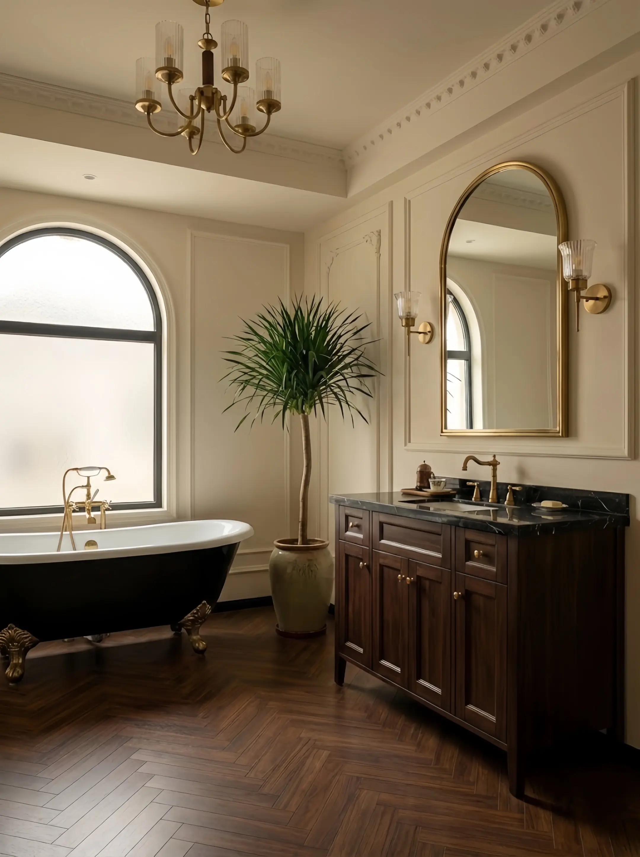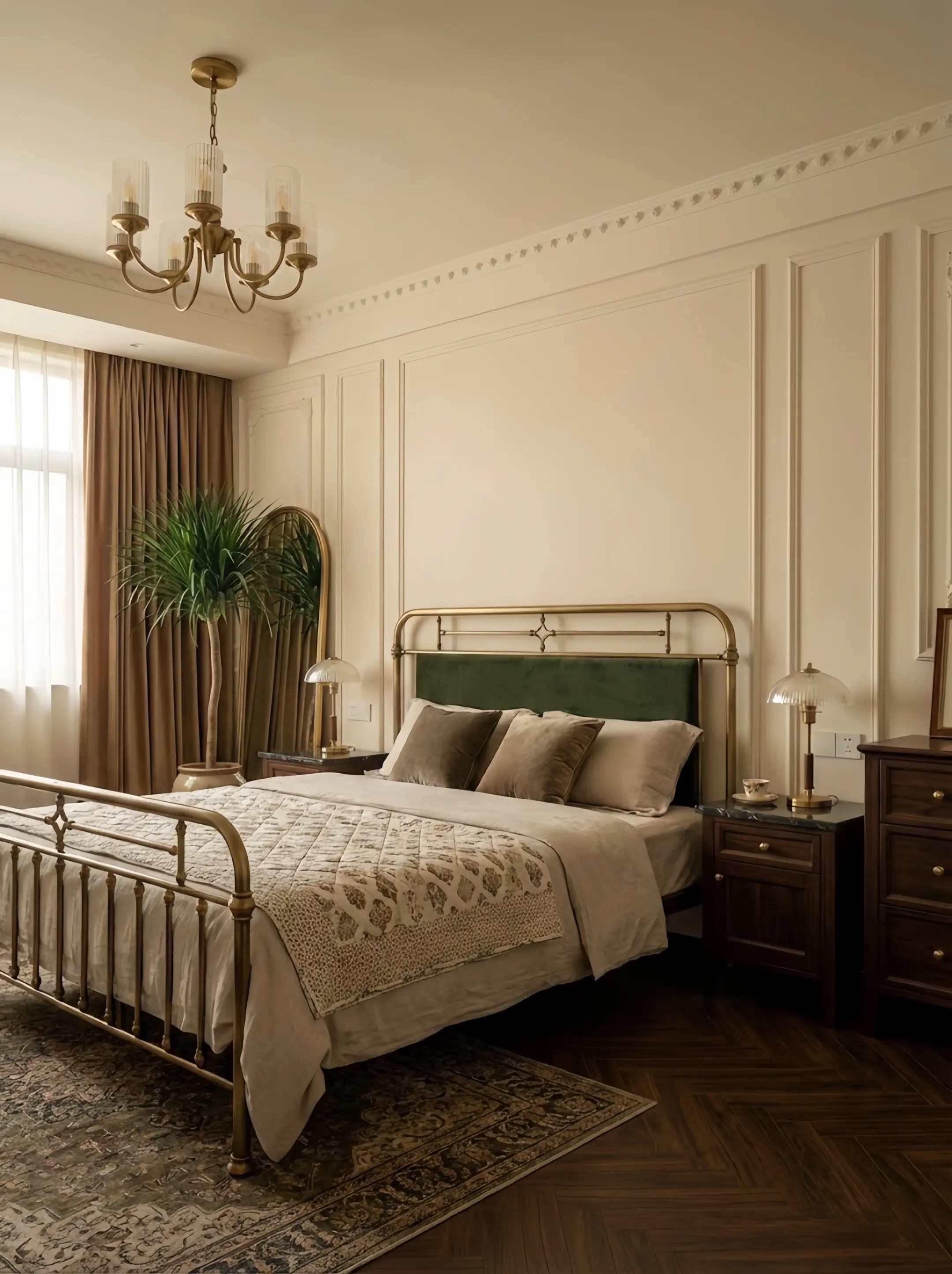 卧室延续了这份浪漫,黄铜质感的床架与温润的木质家具相得益彰。阳光透过纱帘洒在床单上,慵懒感拉满。那个带有独立浴缸的卫生间,更是卸下在大城市一身疲惫的专属角落。🛁