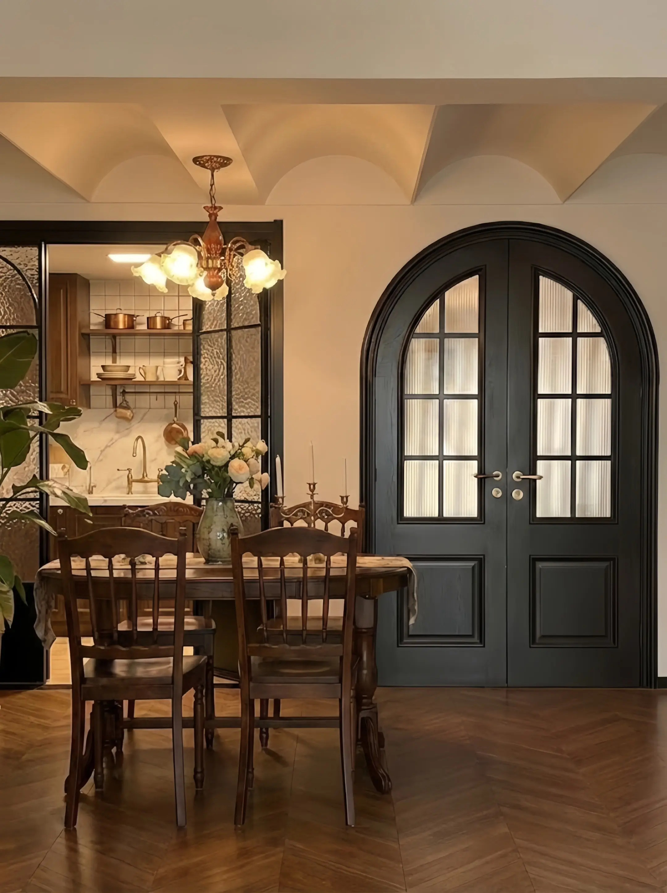 最让人心动的,莫过于那个黑色的拱形双开门设计,不仅延伸了视觉深度,更自带一种电影画面的叙事感。每当黄铜吊灯 ✨ 的暖光亮起,餐厅便有了烛光晚餐的氛围。