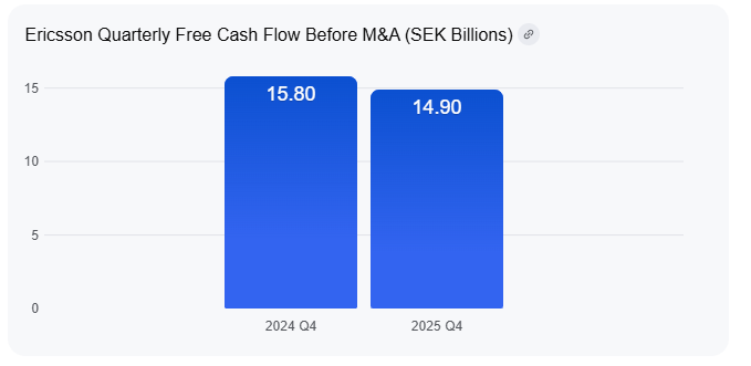 支撑此次股票回购计划的核心在于其充沛的现金流,截至2025年末,爱立信的净现金储备已由上年同期的378亿瑞典克朗大幅增至612亿瑞典克朗,第四季度不计并购的自由现金流达到149亿瑞典克朗,充足的“弹药”储备为股东回报提供了坚实基础。