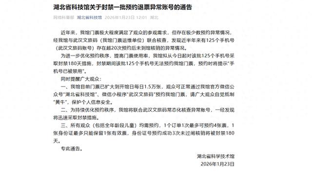 据“湖北省科技馆”微信公众号1月23日发文,该馆与武汉文旅码(我馆门票运维单位)经联合核查,发现近半年来有125个手机号(武汉文旅码账号)存在超20次预约后未到馆核销的异常情况。为进一步优化预约秩序,提高门票使用率,该馆拟从今日(1月23日)起对该批125个手机号采取封禁180天措施。封禁期间,该批125个手机号无法预约该馆门票,预约时将提示“手机号已被禁用”。