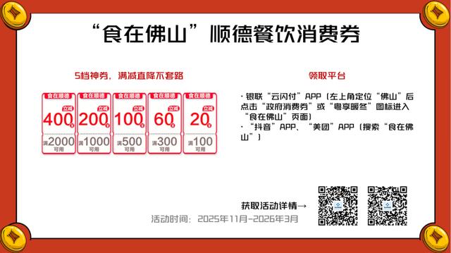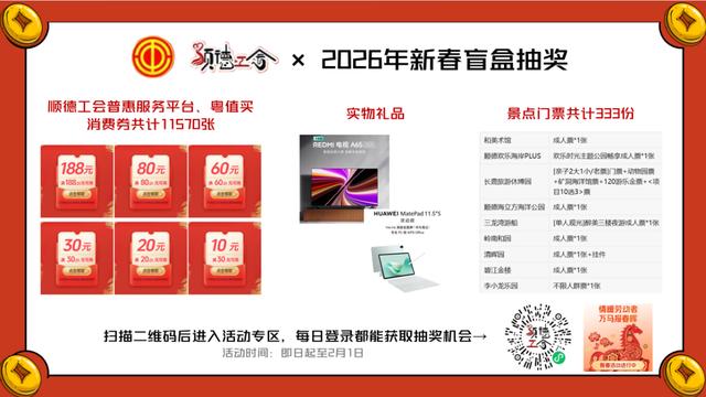 会上,顺德区委宣传部副部长、区文广旅体局副局长吴庆强表示,省文化和旅游厅“请到广东过大年”文旅消费惠民补贴活动已于2025年12月26日正式启动,第一阶段持续至2026年1月22日;第二阶段将从2026年1月23日延续到3月31日,总计2000万元的文旅消费券将陆续发放,覆盖景区门票、酒店住宿、文艺演出、旅游线路等全品类,过年期间市民游客可正常使用。同时,顺德针对新春消费场景,策划了美食、家电、手机数码等多个领域的消费券发放活动,节前集中投放,节中追加额度,确保福利不中断。