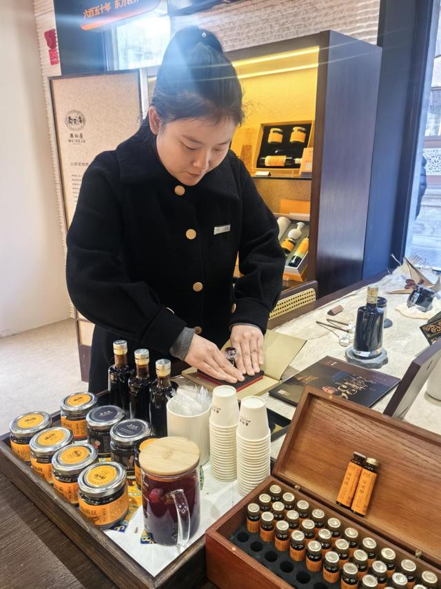 巡礼始于最基础的“食”。踏入美和居,便能看到工作人员在向游客介绍:“我们的非遗也在创新,比如醋泡仔姜、醋泡黑加仑葡萄干等特色产品,让老陈醋以新的方式融入日常。”在柜台盖章处,有一个心照不宣的小小“考验”:“说出美和居年份老醋的三个特征。”观其色如琥珀,澄澈透亮;闻其香,酸味柔和,陈香扑鼻;验其魂,倾倒入碗,醋液挂壁,绵长如丝。工作人员会心一笑将章盖好,这枚印章盖下的,不仅是一处到访的凭证,更像一次对“国家级非物质文化遗产”所代表的严谨标准与时间分量的无声确认。