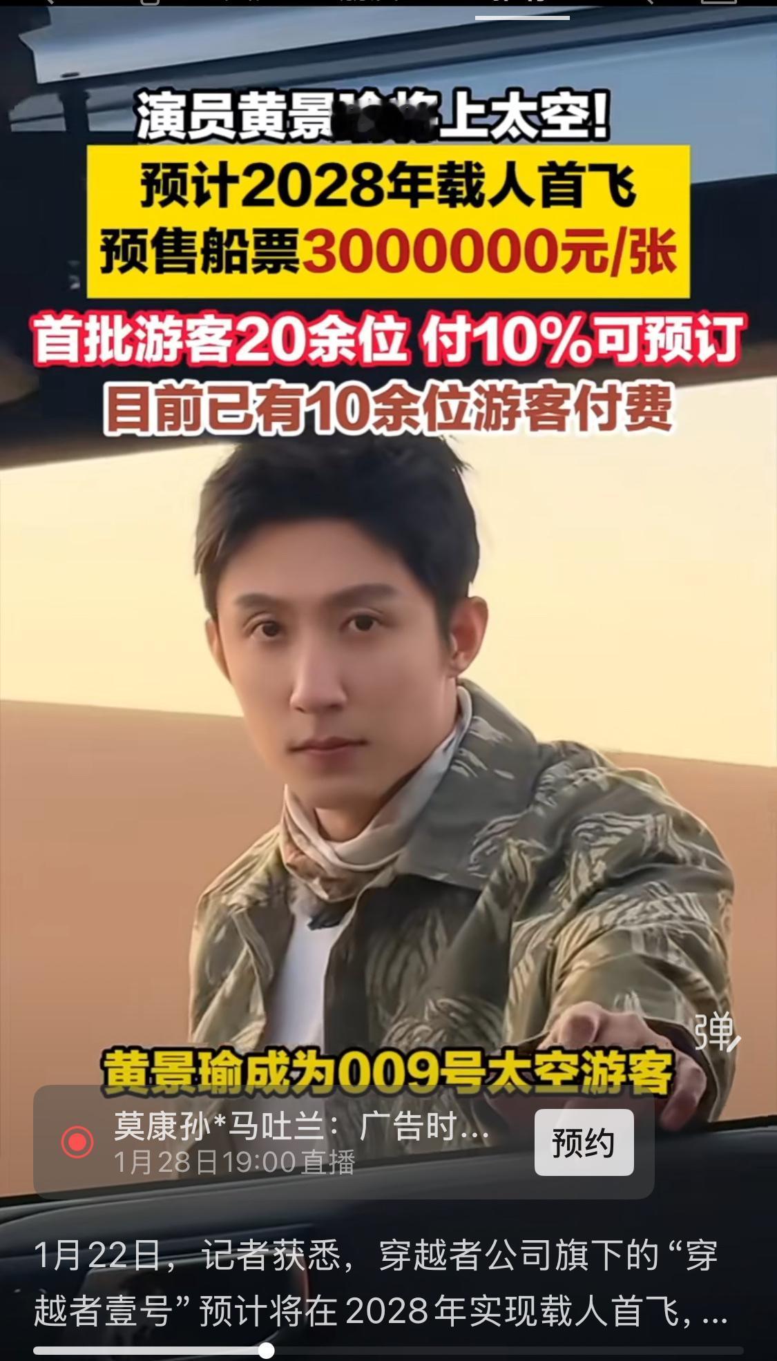 1月22日,穿越者公司旗下的“穿越者壹号”预计将在2028年实现载人首飞,预售船票300万/张,演员黄景瑜在vcr中表示很荣幸成为一名太空旅客。 另有他人表示他也买了space x的飞船船票,付了680万,预计2035年飞火星。[笑哭](另三百万是用来保命的,太空服,加保险) 当然,还要提前做身体训练的,不是谁都有资格去的,身体素质得过关,有钱有体格才行,不是有钱就可以上去的,另外距地一百公里的空间,体验失重感六分钟,三百万性价比对于普通人来说不高,普通老百姓就踏踏实实在地球上待着吧。[捂脸] 穿越者航天的技术实力老百姓知道的不多,但是这波噱头和传播力上是一把好手!