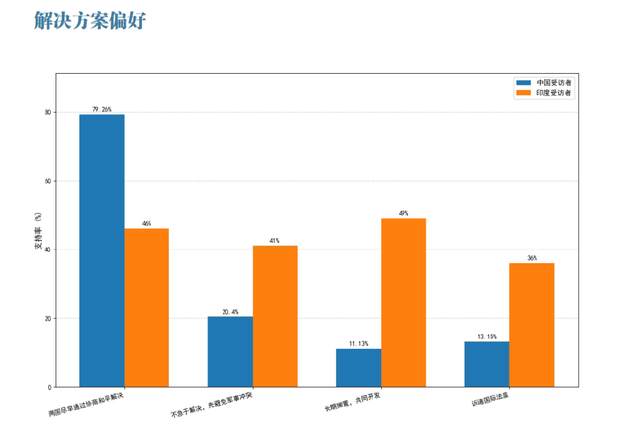 在回答该如何解决中印两国领土争端时,有79.26%的中国受访者选择“两国应尽早通过协商争取和平解决”;选择“不急于解决,先回避偶然的军事冲突”的达到20.4%;选择“长期搁置,实现共同开发”的为11.13%。相比之下,有49%的印度受访者选择“长期搁置,实现共同开发”,有46%选择“两国应尽早通过协商争取和平解决”,有41%选择“不急于解决,先回避偶然的军事冲突”。此外,还分别有13.15%的中国受访者和36%的印度受访者选择了“诉诸国际法庭”的选项。