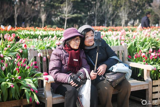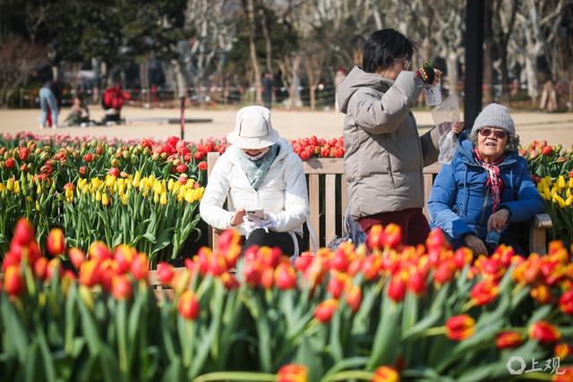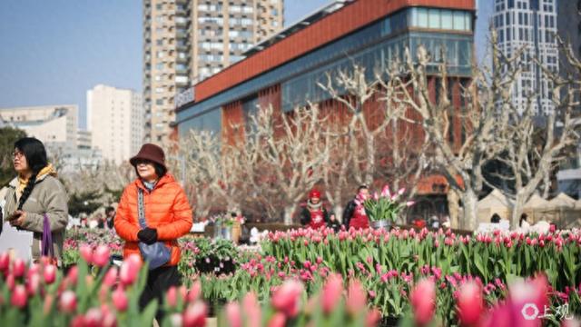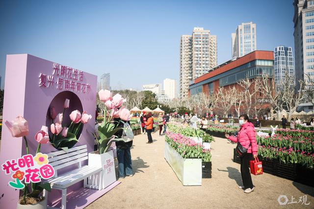 复兴公园大草坪上,超过600平方米的水培郁金香汇成早春花海,粉、白、紫等色块交织成景。