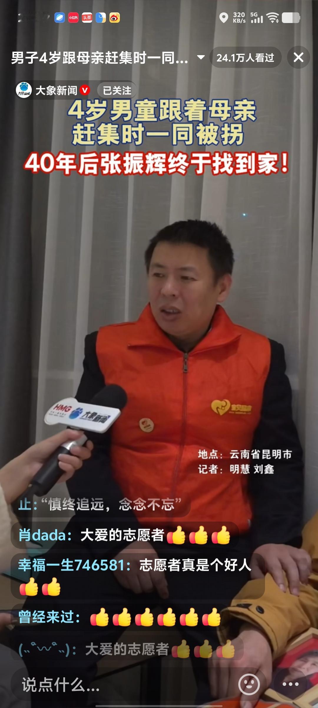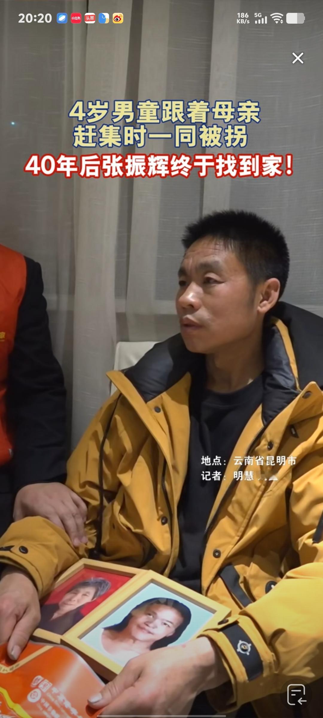 被拐40年的张振辉怀里紧紧抱着母亲和二姐的遗像。面对记者的采访,痛哭失声。 当年他才4岁,和妈妈去赶集的时候一起被拐。后来到了养父的家里。 小的时候因为妈妈不识字,养父的家里还穷。所以妈妈直到死也没有回到故乡。 只留下外公家一个模糊的地址。张振辉带着母亲的遗愿,2015年采血入库。东奔西走找家。 后来辞去了工作。一边收破烂。一边寻找原生家庭,只要听说哪里有消息,他就开始四处奔走。 在宝贝回家志愿者的10多年接力帮忙之下,终于找到了自己的原生家庭,明天他就能和大姐团聚了。 同时他也听说了一个很不幸的消息。当年二姐也在寻找。他的时候被人给拐走了,后来发生不幸去世了。 这件事过程中充满苦难和波折。但幸好结局是圆满的,在所有人的努力之下。他找了40年的家,终于团圆了。 据他说,养父对他还行,但是身体不好,后来就得了脑血栓,不能自理了,所以也可想而知这一路走来的生活。肯定很苦。希望以后的日子都是甜的。