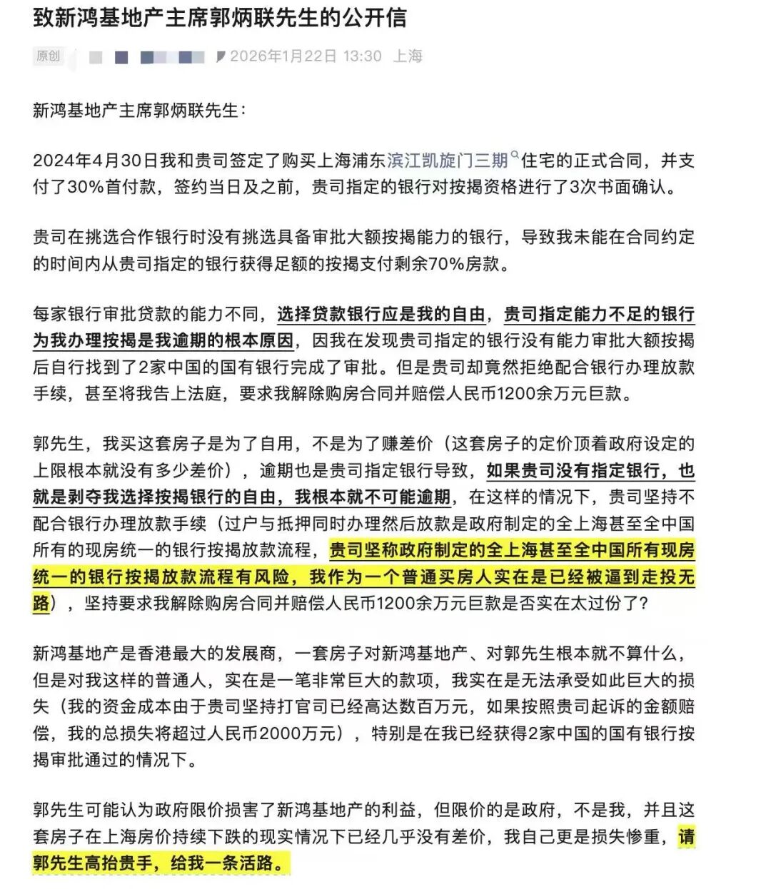 1月22日,市场流出一则《致新鸿基地产主席郭炳联的公开信》,一名自称购买了滨江凯旋门的购房者认为,新鸿基地产在挑选合作银行时没有挑选具备审批大额按揭能力的银行,导致自己未能在合同约定的时间内支付剩余房款,而被要求解除购房合同。
