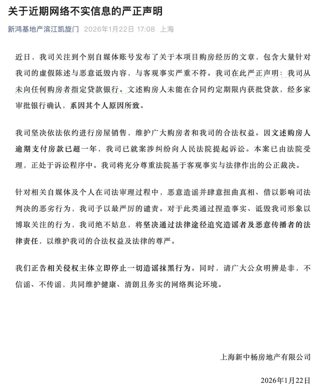 同日,滨江凯旋门通过官方微信发布声明,否认了上述购房者的指控,称内容虚假陈述、恶意诋毁,与客观事实严重不符。