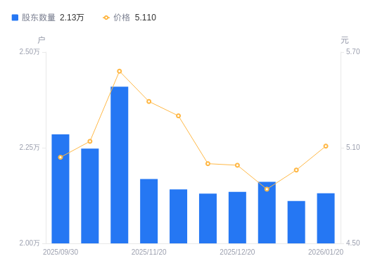 日期A股户数(户)流通A股户均持股数(股)户均持股市值(万元)2026-01-202131015369.417.852026-01-102110815516.507.702025-12-312161015156.057.342025-12-202134715342.787.662025-12-102130115375.917.692025-11-302141315295.498.112025-11-202168215105.728.142025-11-102409613592.397.582025-10-202247814570.797.492025-09-302284914334.207.22
