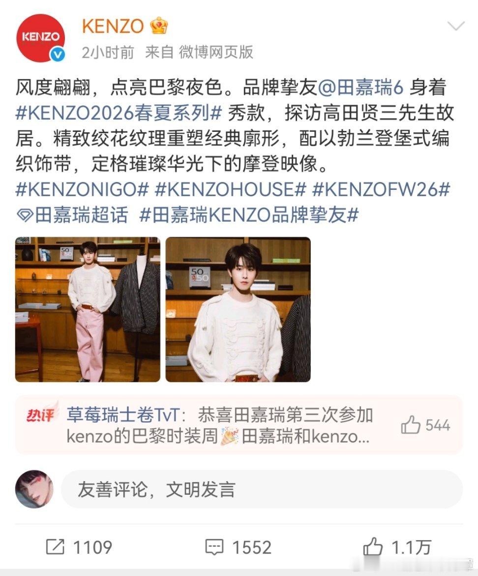 田嘉瑞KENZO品牌挚友Kenzo八百年没宣过内娱明星了,恭喜这个田嘉瑞~