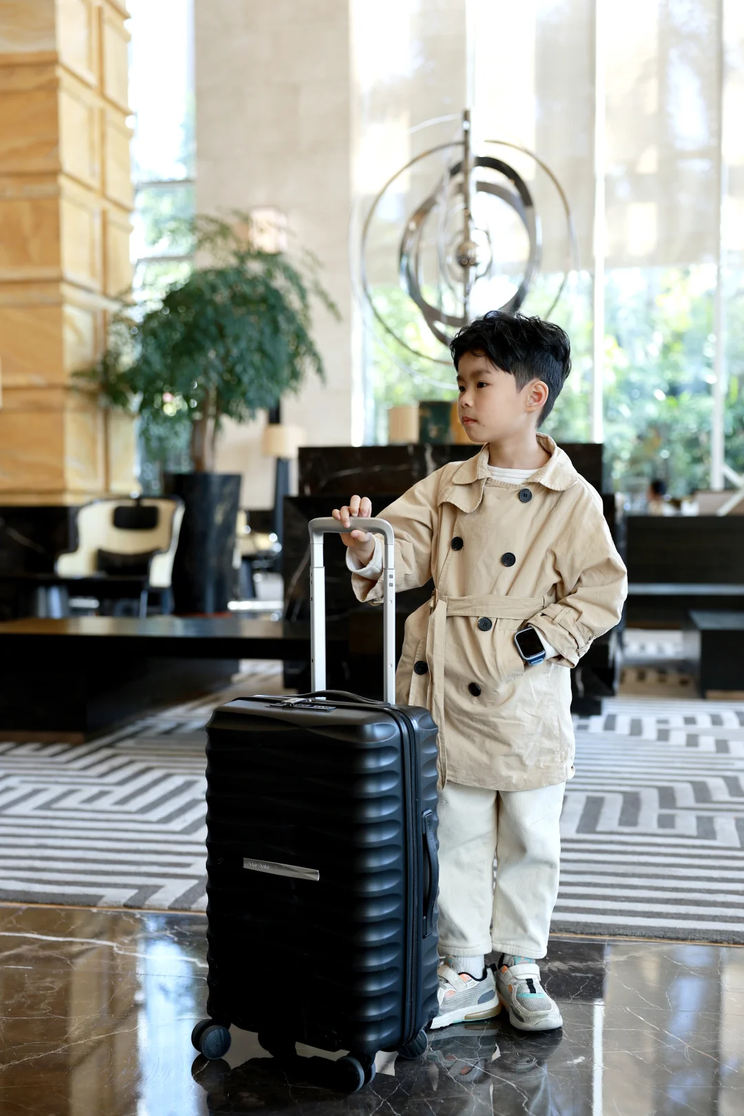登机箱只有2.7kg!PP材质超轻盈,但韧性十足。我试过装满后让宝宝坐在上面推行,轮子依然顺滑安静,箱体稳稳的。