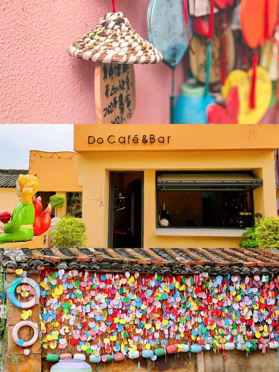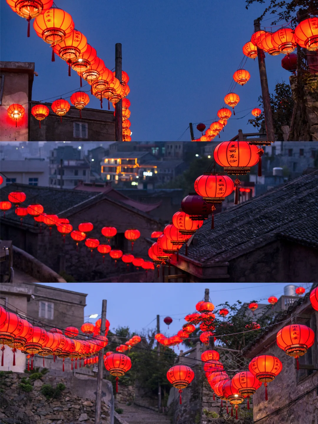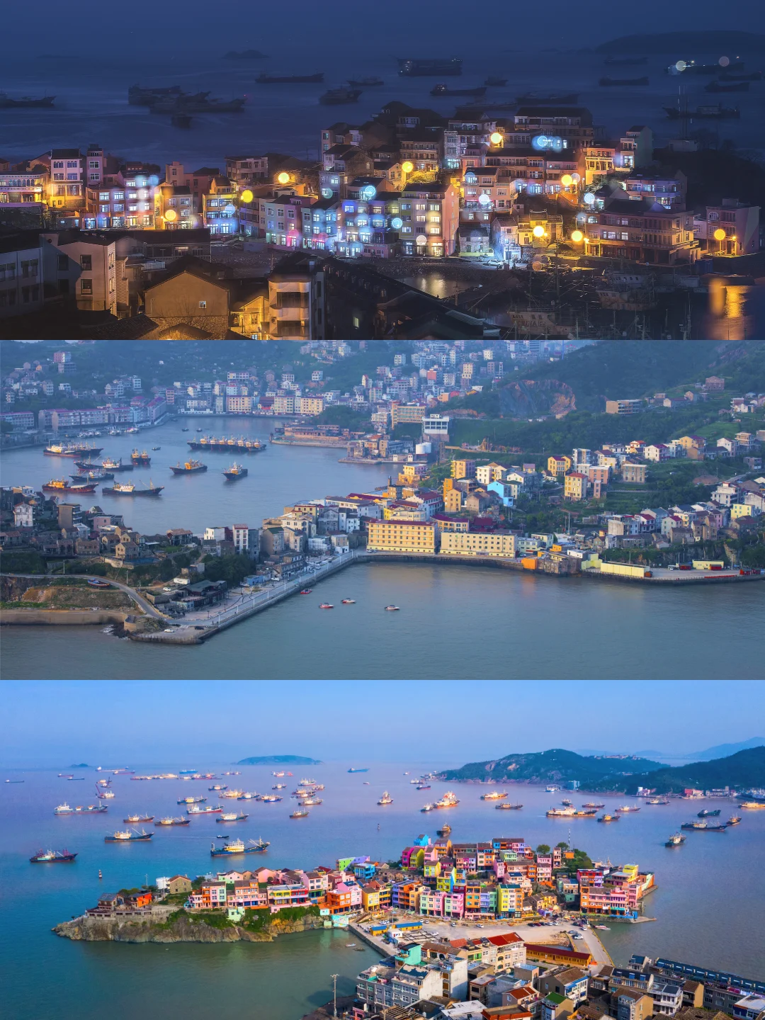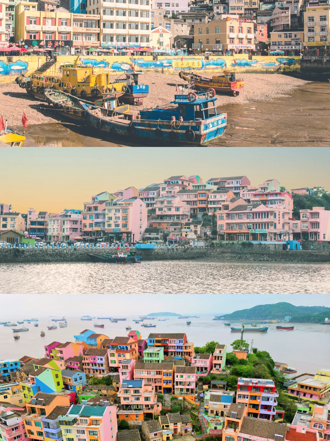 马卡龙色房子+海边落日,春节时常有门贴春联、晾晒鱼干的渔家场景。