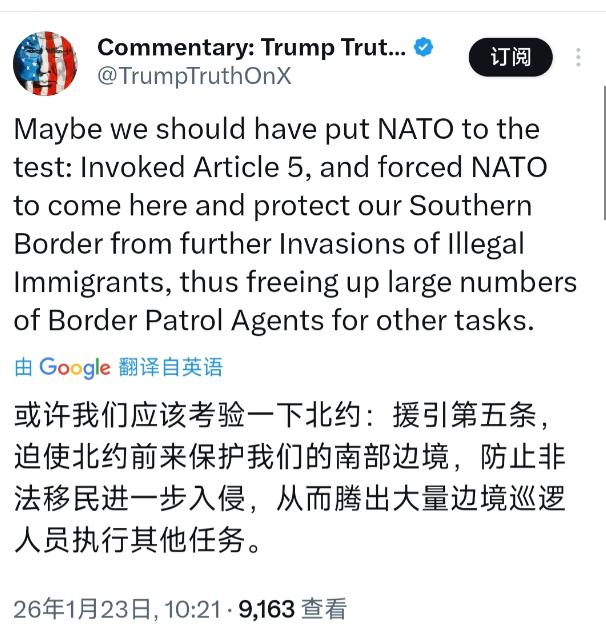 特朗普今天(北京时间1月23日)发文写道:“或许我们应该考验一下北约:援引第五条,迫使北约前来保护我们的南部边境,防止非法移民进一步入侵,从而腾出大量边境巡逻人员执行其他任务。” 特朗普在北京时间1月23日发了一条文,内容很明确,就是说或许应该考验一下北约,办法是援引北约的第五条,逼着北约成员国来保护美国的南部边境,挡住非法移民继续往美国进,这样就能腾出不少边境巡逻的人,去做别的任务。 这条文是他在自己自创的社交平台上发的,当地时间其实是1月22日,对应到北京时间就是23日,这也是官方媒体报道过的情况。 大家可能不太清楚北约第五条到底是什么,说白了就是北约的集体防御条款,意思是只要有一个北约成员国遭到武装攻击,就相当于所有北约成员国都被攻击了,其他成员国都得过来帮忙。 根据北约官方的说明,这个条款自从1949年北约成立以来,就一直是北约最核心的原则,历史上只被援引过一次,就是2001年9·11事件之后,北约成员国一起支持美国发动了阿富汗战争。 特朗普提出来要用这个条款来让北约保护美国南部边境,防止非法移民,很快就引发了质疑,有网友说,这个条款本来是针对武装攻击的,非法移民显然不属于这个范畴,根本不适用。 其实这也不是特朗普第一次关注美国南部边境的非法移民问题,他之前还发布过阻止越境移民在美寻求庇护的行政令,只不过后来被美国法官裁决违法了。 另外,了解特朗普的人都知道,他之前就经常抱怨北约,说美国在北约里付出了很多,但得到的回报却很少,还曾经质疑过北约其他成员国会不会在美國遇到攻击时出手相助。 所以这次他提出援引北约第五条,一方面是想解决南部边境的非法移民问题,腾出巡逻人员,另一方面,或许也和他一直以来对北约的不满态度有关。 截至目前,北约方面还没有对特朗普的这条发文作出明确回应,不清楚后续会不会就这个提议和美国进行沟通。 整个事情的核心就是特朗普想借助北约的集体防御条款,解决自己国家的边境移民问题,只是这个提议能不能行得通,还有很多争议,毕竟条款的适用范围和非法移民问题,本质上并不是一回事。 以上都是个人观点,对此您有什么不同的看法,可以在评论区留言讨论!!!