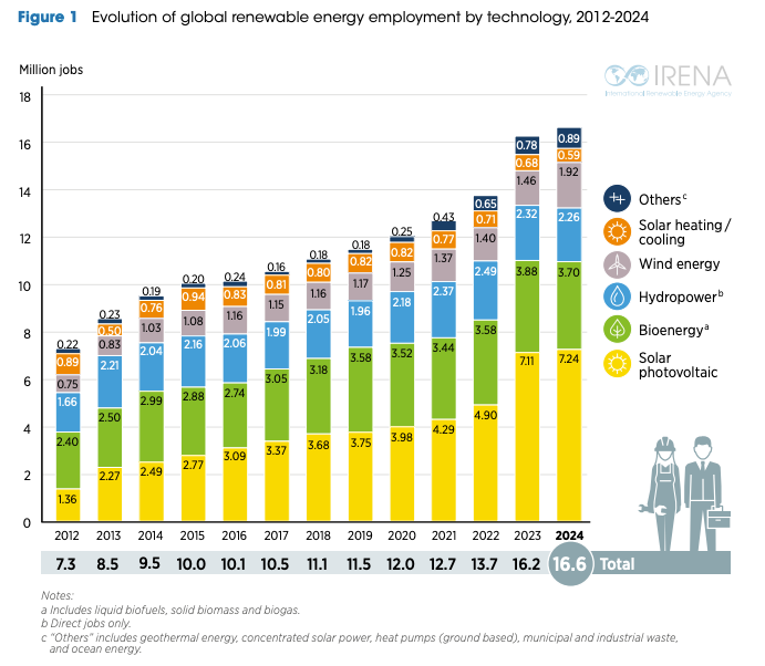 报告显示,2024年全球可再生能源新增装机达到历史新高,但就业人数仅从上一年的1620万人增加到1660万人。