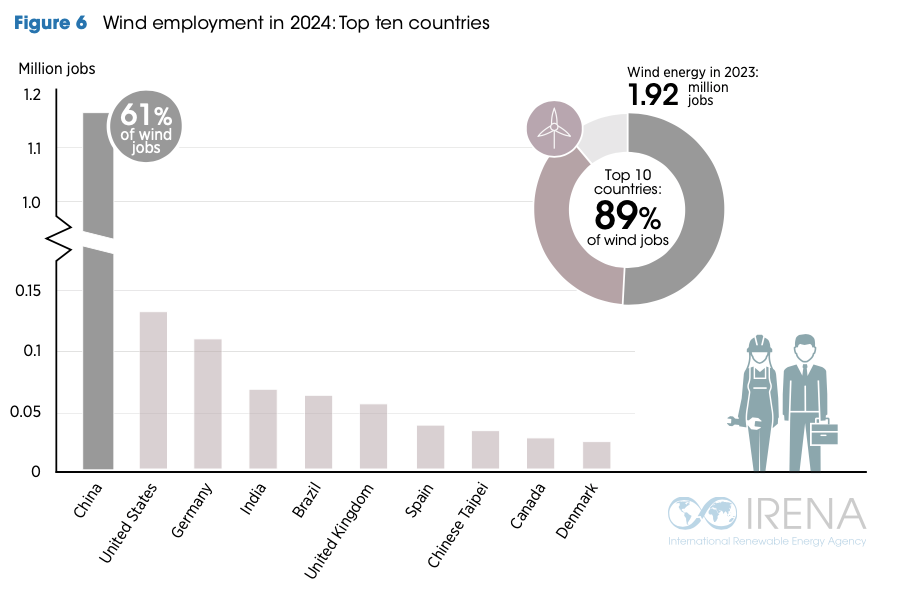 正因如此,尽管中国风电就业在2024年出现明显回升,全球风电就业规模的扩张仍然十分有限。