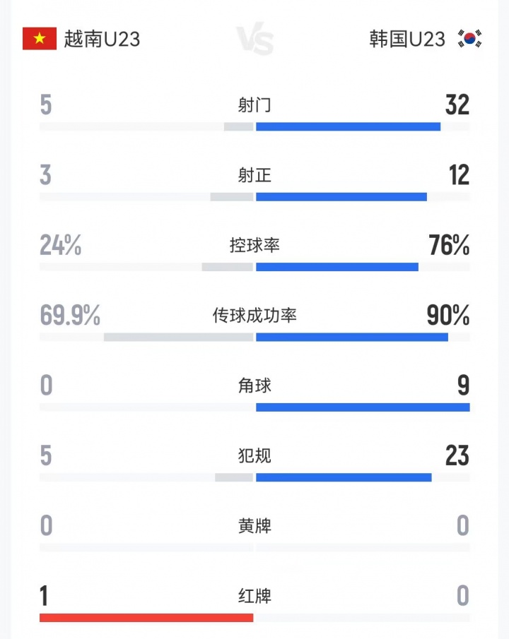 120分钟越南U23 2-2 韩国U23数据:韩国32射12正,控球达到76%!