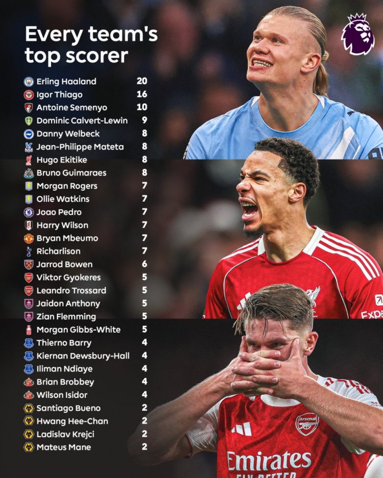 直播吧1月24日讯英超官方列本赛季各队联赛射手王,曼城哈兰德、切尔西若昂·佩德罗、曼联姆伯莫、阿森纳约克雷斯+特罗萨德、利物浦埃基蒂克、热刺里沙利松。