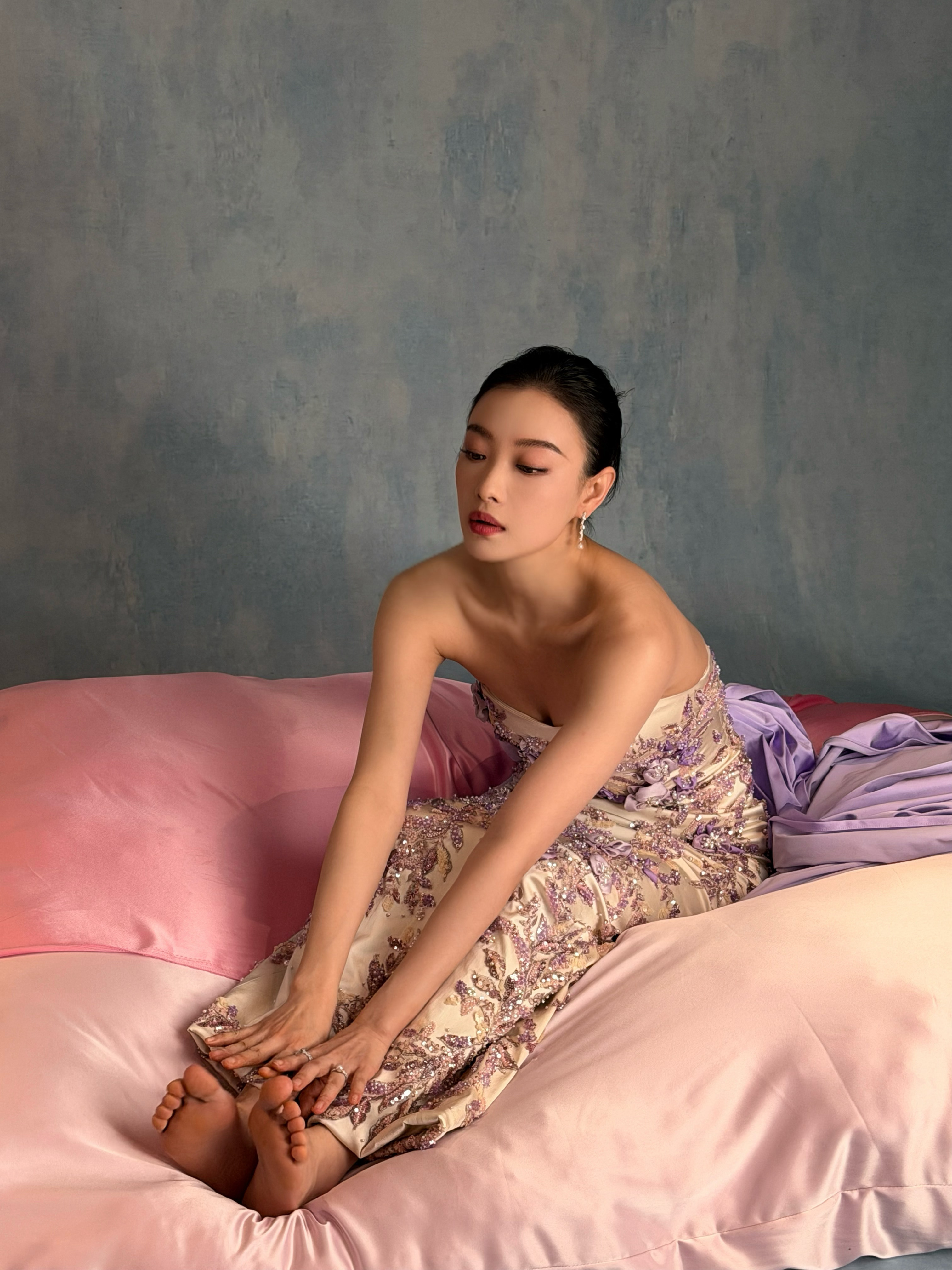 刘亦菲全新妆造:身着路易威登定制礼服,金色流光,熠熠飞舞。刘亦菲