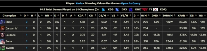 直播吧1月24日讯 昨日T1对阵KT的第一局比赛中,T1辅助选手Keira选出丽桑卓辅助,至此Keria职业生涯已经使用61个不同英雄,其中Keria的56个不同英雄均获得胜场,未能取胜的英雄有:妖姬、老鼠、皇子、慎、琴女!