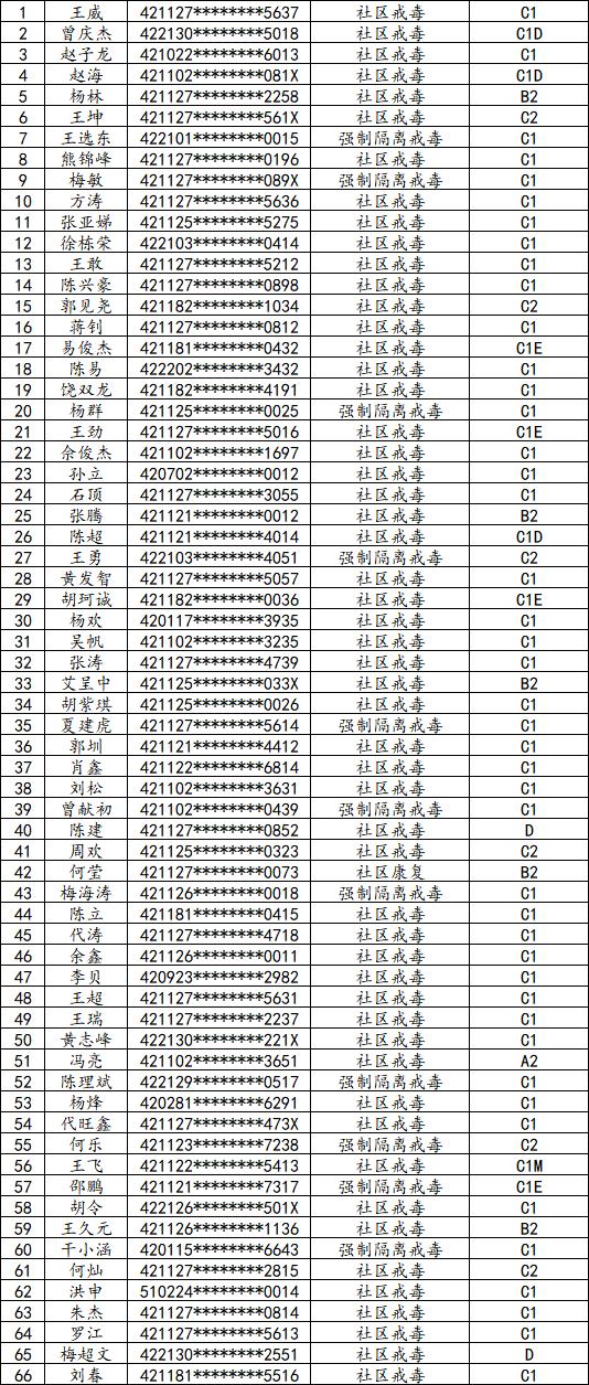 根据《机动车驾驶证申领和使用规定》(公安部172号令)第七十九条之规定,机动车驾驶人具有下列情形之一的,车辆管理所应当注销机动车驾驶证:“被查获时有吸食、注射毒品后驾驶机动车行为,被依法责令社区戒毒、社区康复或者决定强制隔离戒毒,或者长期服用依赖性精神药品成瘾尚未解除的”。请以下人员在本公告发布之日起三十日内携带本人身份证和驾驶证到黄冈市公安局交通管理支队车辆管理所办理机动车驾驶证注销业务。逾期未办理的,机动车驾驶证将依法注销并公告作废。