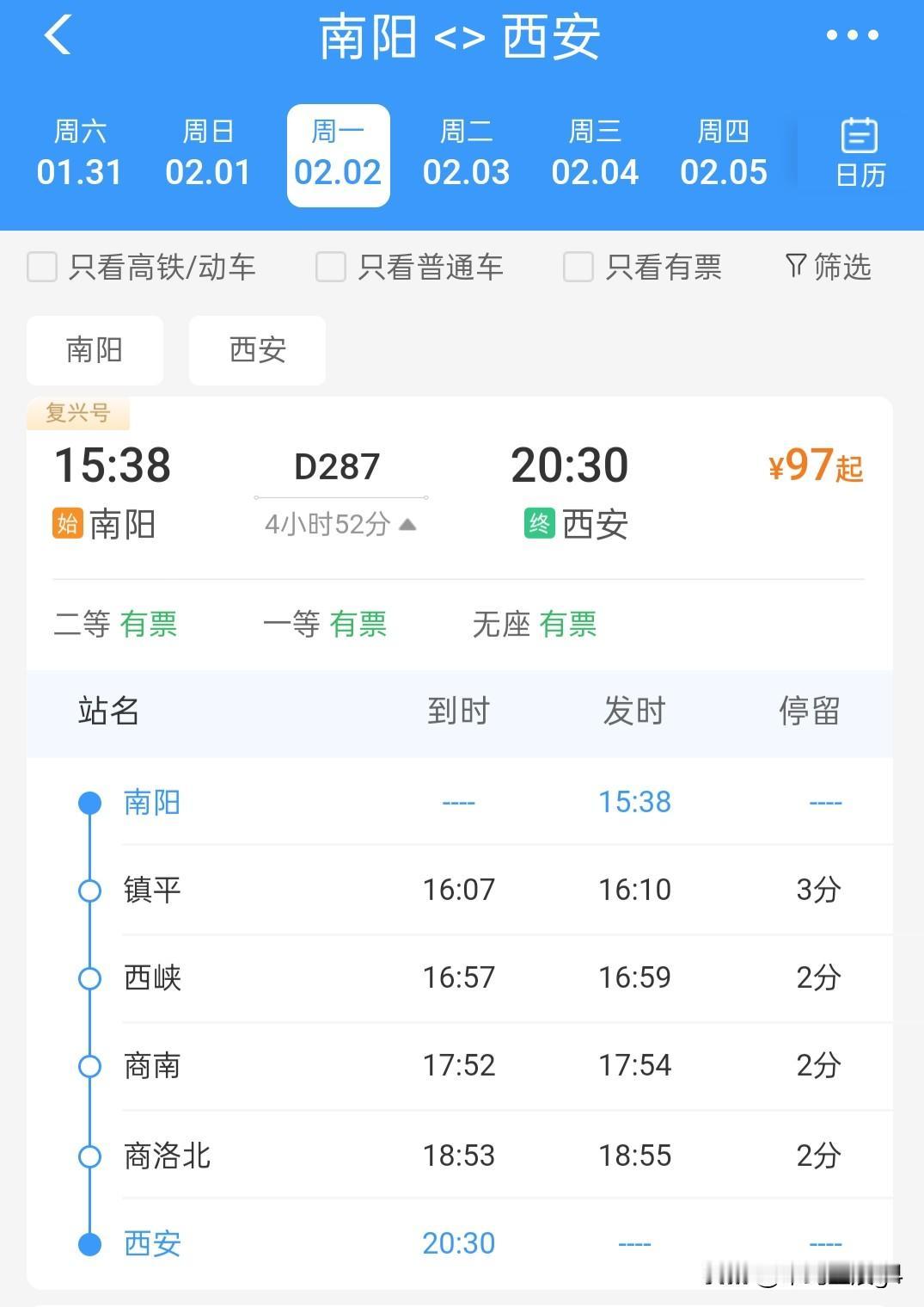 2月2日起,西安到南阳开行始发终到直达动车,西安南阳高铁前奏? 西安和南阳都是有高铁的城市,但是没有直通高铁列车开行。二者又都是有普速铁路的城市,有一条宁西铁路连接两地。 而2026年2月2日起,西安到南阳,途经宁西铁路,开行一对,始发终到动车组列车,将结束两地无动车组列车到发的历史,这一对列车车型为CR200J型,最高时速为160公里,西安到南阳全程约5小时,将成为两地间最快的列车车次之一。 其中D288次列车,西安站出发,途经陕西段已开通动车的城市渭南西、商洛、商南等车站,以及停靠河南段,将首次开行动车的西峡、镇平和南阳站三个站点。这趟列车早上出发,下午到达,在下午返程开D287,晚上回到西安。途经镇平站,西峡站,商洛北站,两城在商洛市停靠的车站并不相同。 西安到南阳有一条西商南高铁线路的规划,在南阳继续连接规划当中的南线合高铁,形成西安到南阳到合肥的高铁新通道,2026年,南信合高铁预计将获批开工建设,西安到南阳路段,预计也将加快开展前期。 同年2026年6月,位于西安市的西安东站预计开通运营,经由西十高铁、汉十高铁、郑渝高铁等线路,途经商洛、十堰、襄阳,可以开行到南阳的直达高铁列车,也将缩短西安到南阳的旅程时间。