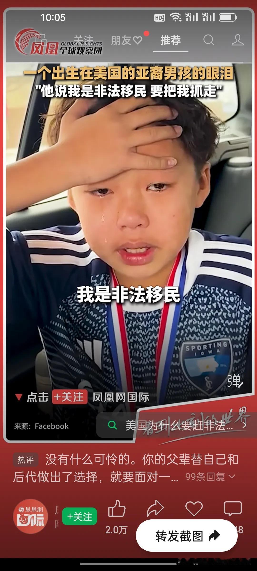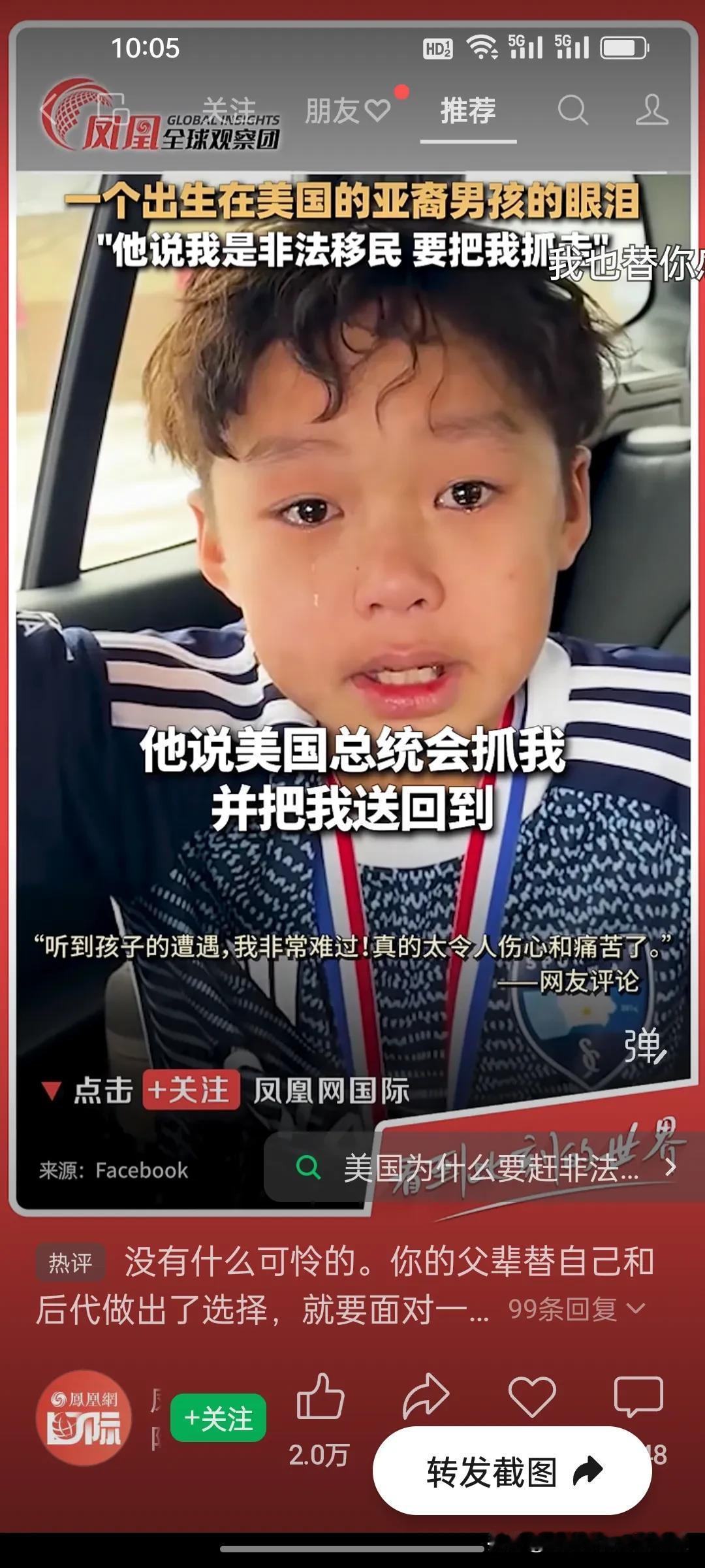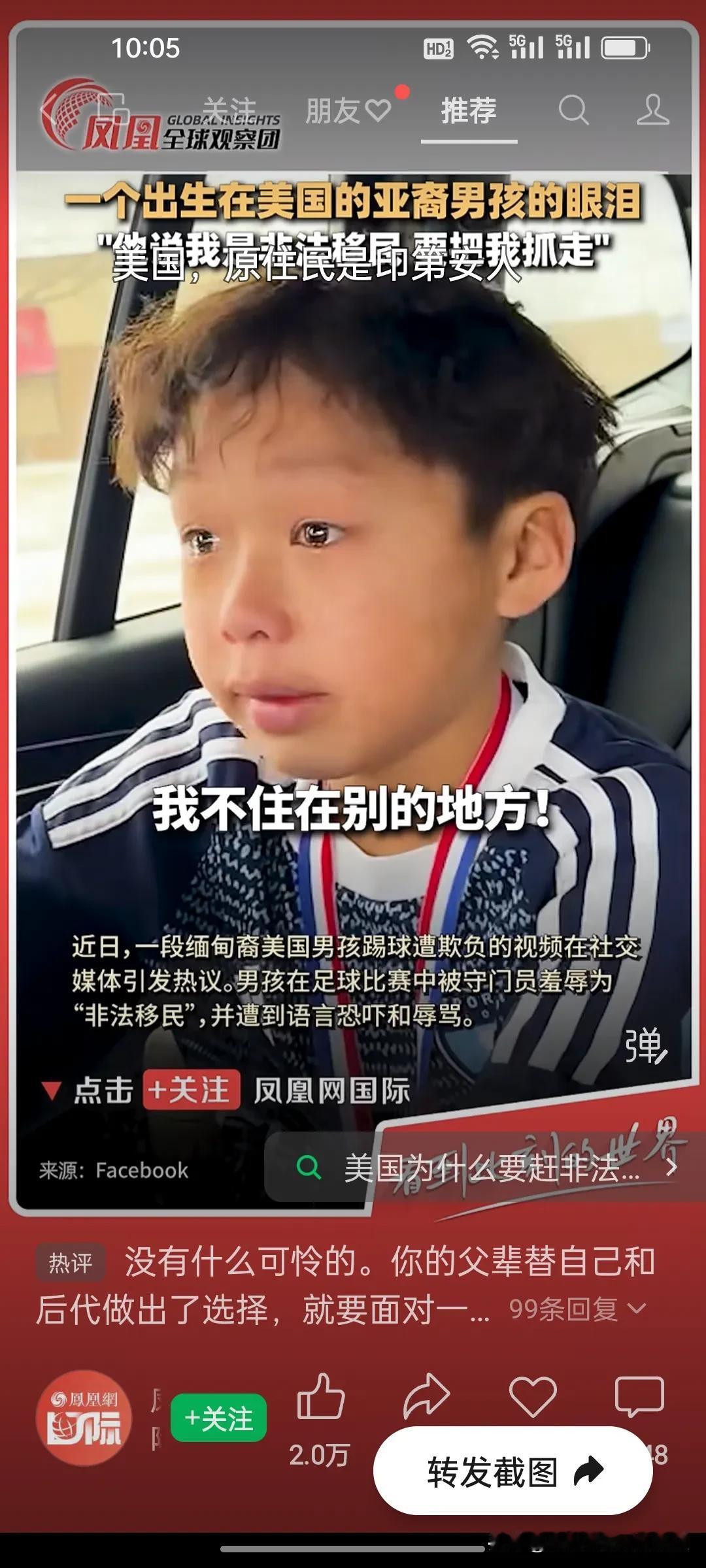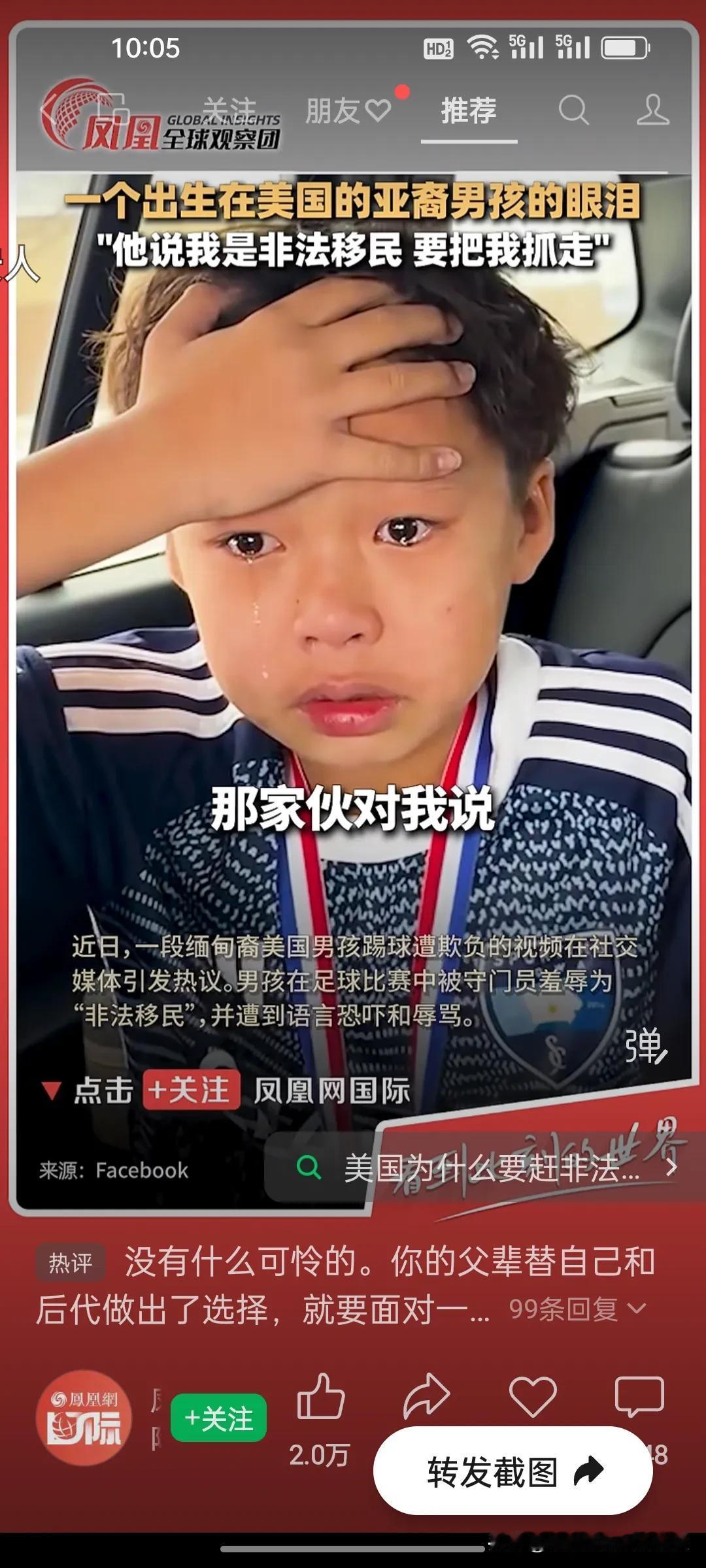 特朗普政府驱赶非法移民的行径对美国的教育已经产生很大的影响。 特朗普政府之前强烈批评拜登政府时期的多元性别的政策摧毁美国教育,但是特朗普政府对于非法移民的政策已经深深刺痛了非欧美长相的孩子。 根据凤凰网报道,一位缅甸裔美国男孩在足球比赛时被作为守门员的另一个孩子羞辱,说他是非法移民,恐吓并辱骂他,说美国总统会抓他并送回到原来住的地方,这个男孩哭着对着镜头说,他想不通为什么要这么对他,他出生在美国。 特朗普的移民政策,实质是煽动种族对立、制造排外恐慌。出生在美国的少数族裔孩子遭羞辱恐吓,便是恶果。它撕裂社会、践踏平等,让偏见扎根校园,毁掉孩子纯真,背弃多元价值,尽显其“美国优先”政策的狭隘与自私,终将加剧美国分裂。