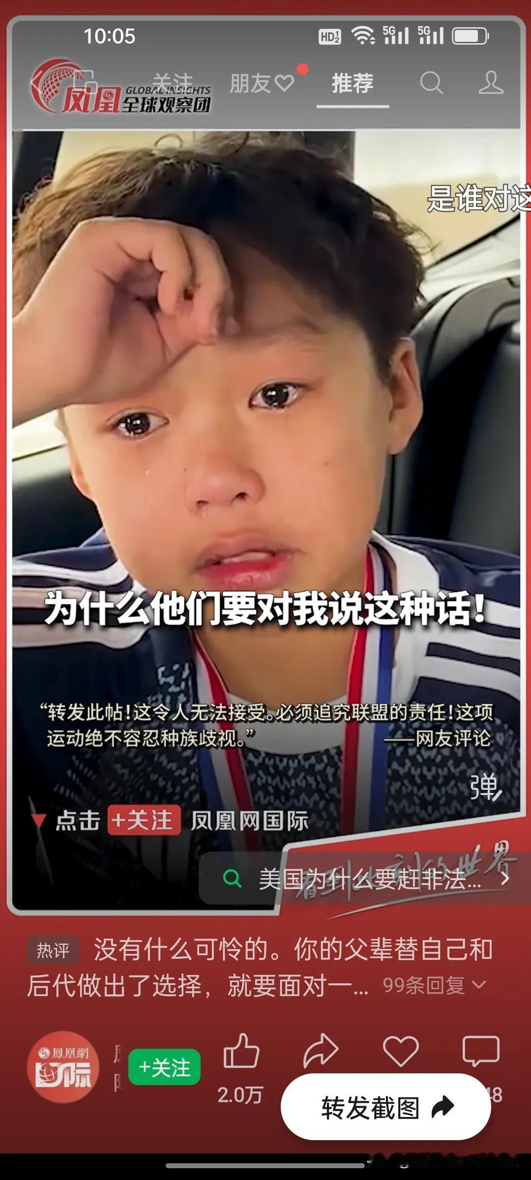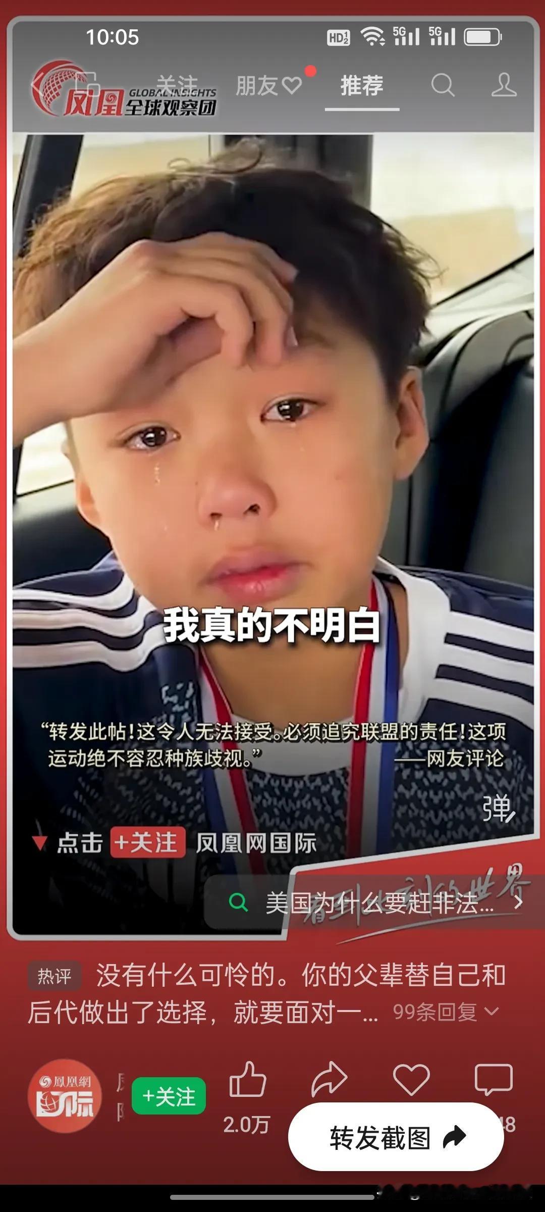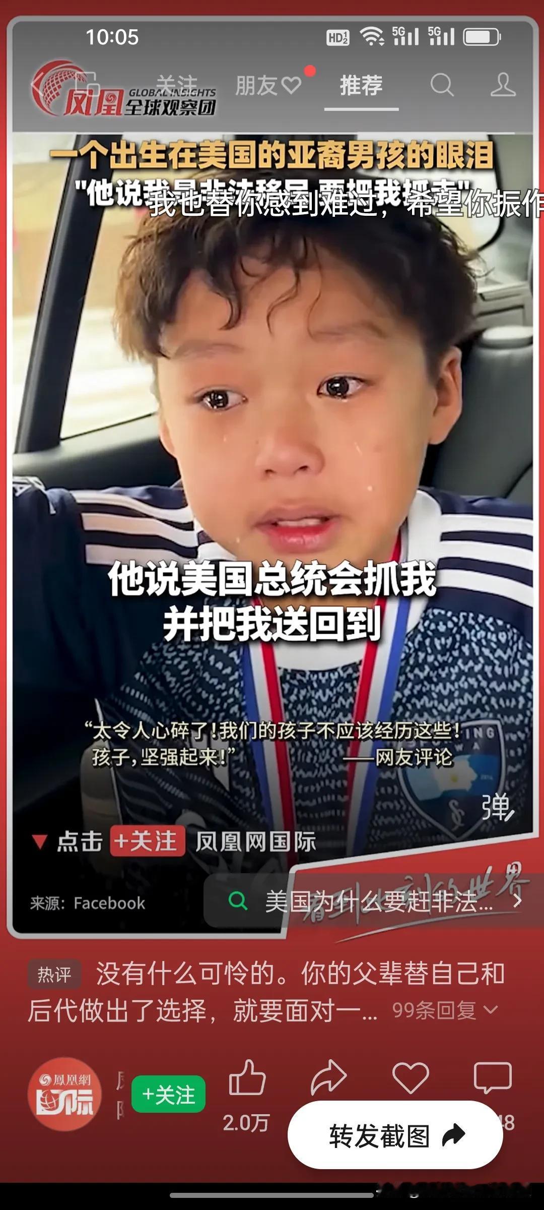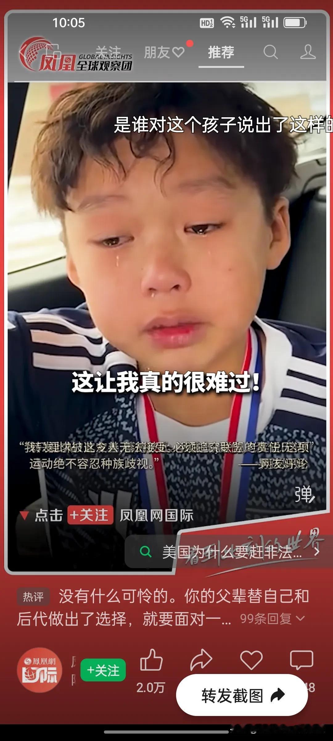 特朗普政府驱赶非法移民的行径对美国的教育已经产生很大的影响。 特朗普政府之前强烈批评拜登政府时期的多元性别的政策摧毁美国教育,但是特朗普政府对于非法移民的政策已经深深刺痛了非欧美长相的孩子。 根据凤凰网报道,一位缅甸裔美国男孩在足球比赛时被作为守门员的另一个孩子羞辱,说他是非法移民,恐吓并辱骂他,说美国总统会抓他并送回到原来住的地方,这个男孩哭着对着镜头说,他想不通为什么要这么对他,他出生在美国。 特朗普的移民政策,实质是煽动种族对立、制造排外恐慌。出生在美国的少数族裔孩子遭羞辱恐吓,便是恶果。它撕裂社会、践踏平等,让偏见扎根校园,毁掉孩子纯真,背弃多元价值,尽显其“美国优先”政策的狭隘与自私,终将加剧美国分裂。
