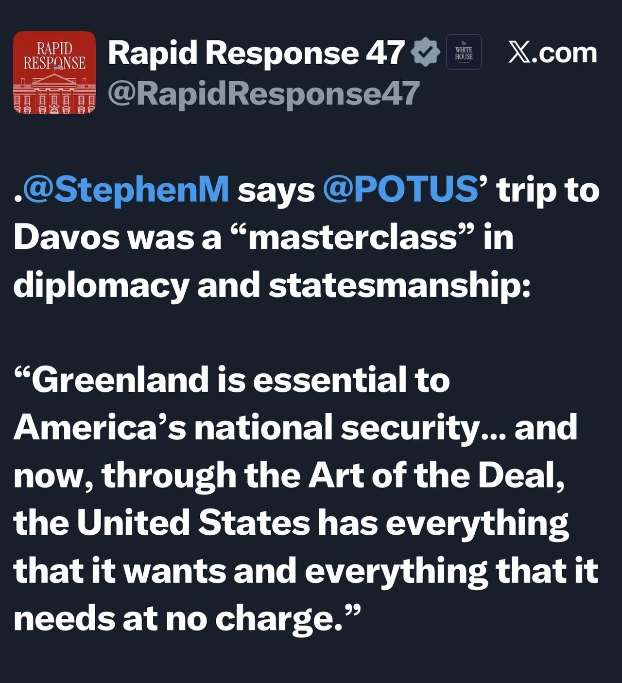 美国白宫副幕僚长斯蒂芬.米勒StephenM说特朗普的“达沃斯之行是一次外交和政治家风范的‘大师班’”: “格陵兰岛对美国的国家安全至关重要……现在,通过《交易的艺术》,美国可以免费获得它想要的一切和需要的一切。”
