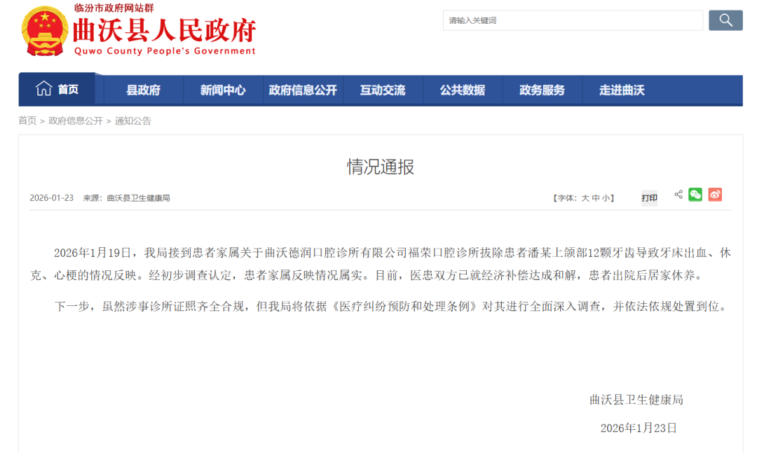 2026年1月19日,我局接到患者家属关于曲沃德润口腔诊所有限公司福荣口腔诊所拔除患者潘某上颌部12颗牙齿导致牙床出血、休克、心梗的情况反映。经初步调查认定,患者家属反映情况属实。目前,医患双方已就经济补偿达成和解,患者出院后居家休养。