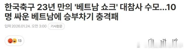 【巨大耻辱】韩国队在U23亚洲杯季军赛点球大战不敌10人越南。韩媒将这场比赛形容为韩国足球的“巨大耻辱”。U23越南9比8韩国U23 韩媒标题:韩国足球时隔23年遭遇“越南冲击”耻辱惨败……对阵10人作战的越南在点球大战中震惊落败。韩国U23自2006年与越南U23交手9次,取得6胜3平的战绩。但本场比赛是韩国自2003年亚洲杯预选赛成年队0-1爆冷不敌越南后,时隔23年再次输给越南。