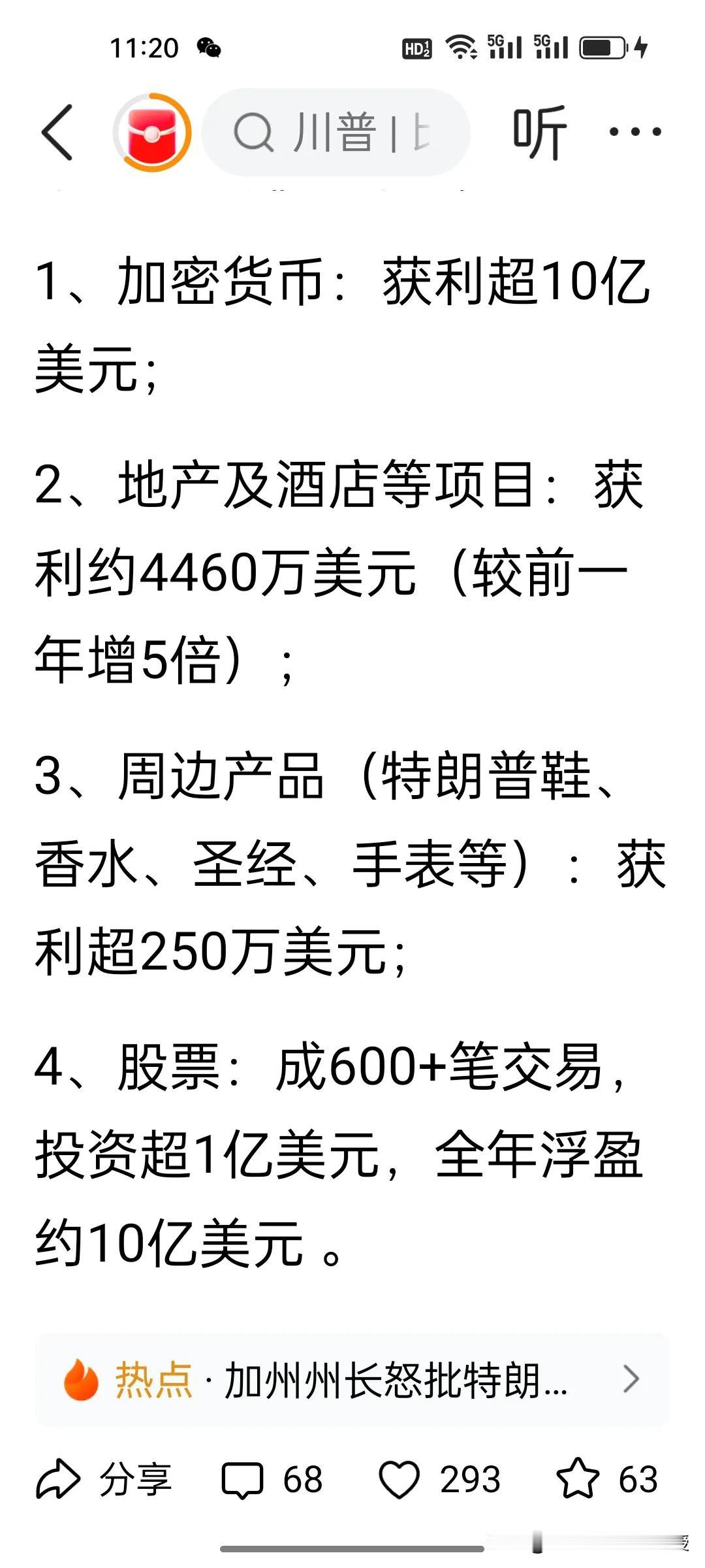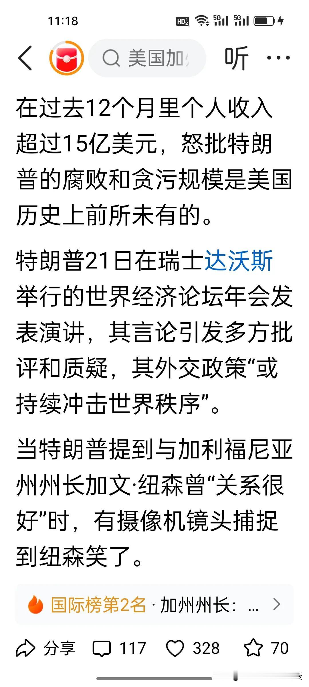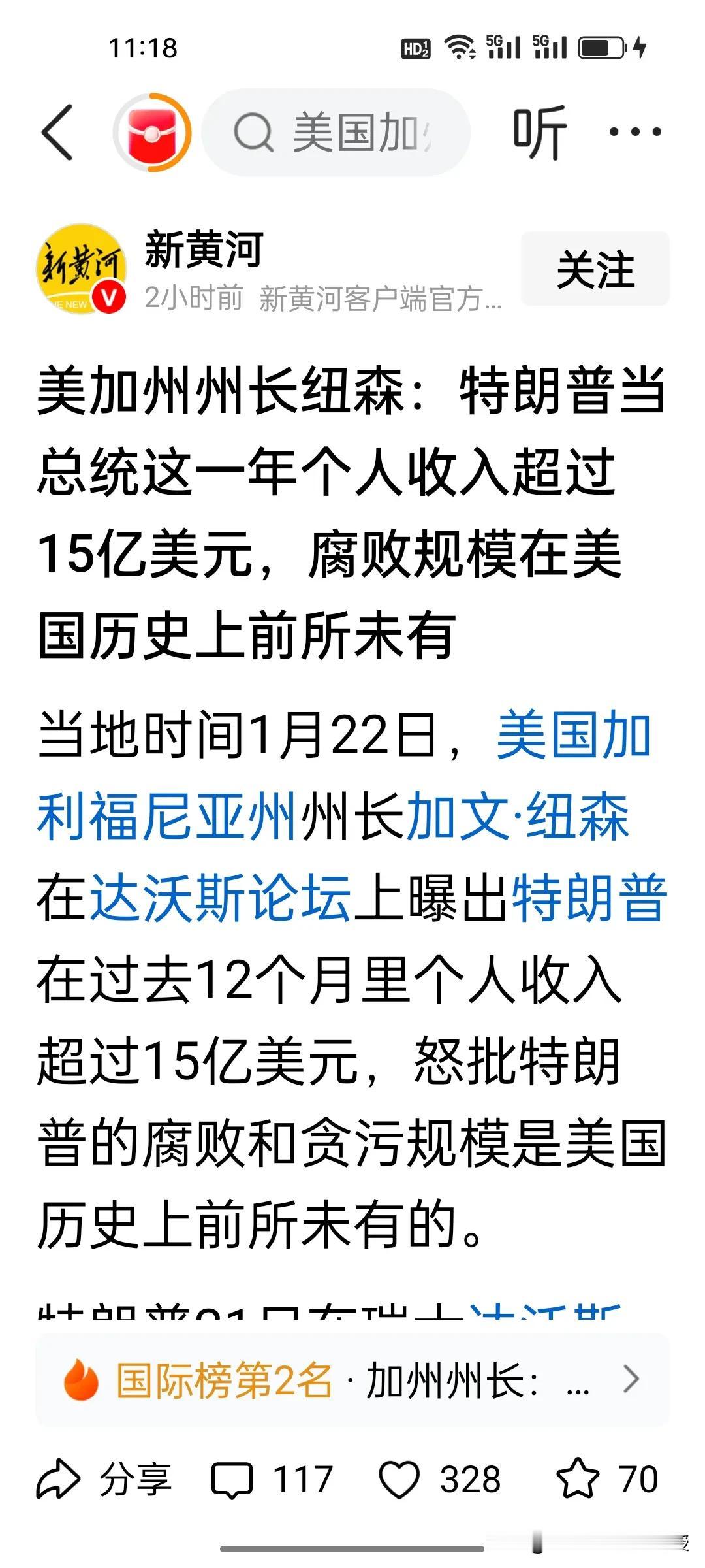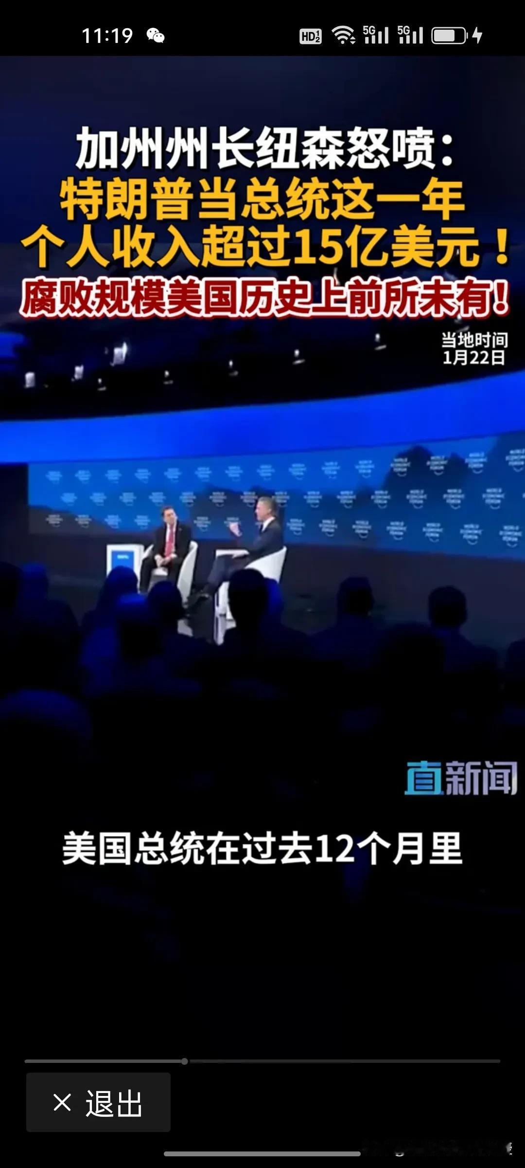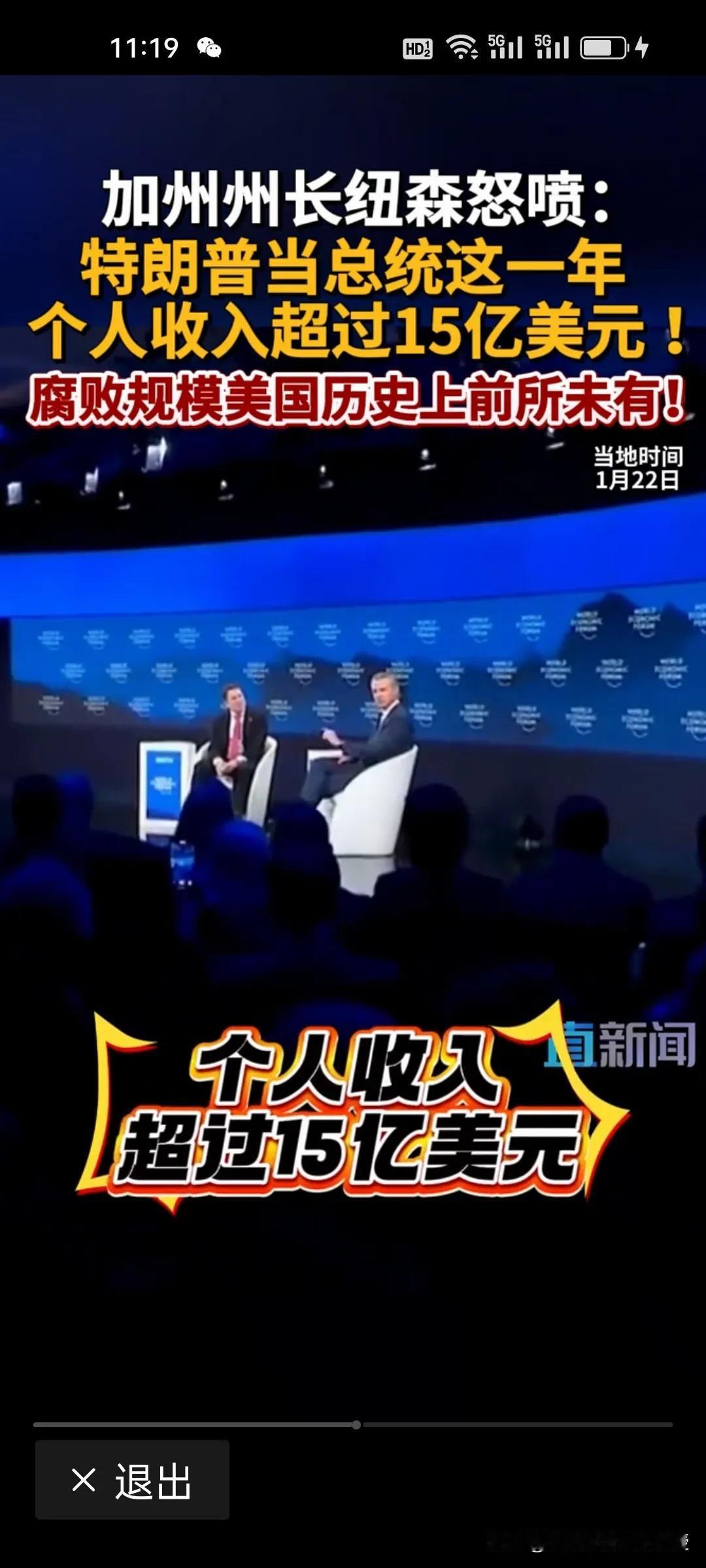 加州州长纽森这是一点面子都不给特朗普啊!爆料特朗普一年收入超过15亿美元,让世人瞠目结舌! 首先就是利用关税政策反复收割资本市场,“画k线”让其女婿等人赚得盆满钵满,具体是多少个亿不得而知,另一块收入就是加密货币,还跟华人首富赵长鹏合作上了,全家都是币圈忠实拥趸,还有就是主业房地产,去年拿了越南土地开发房地产业务,及特朗普周边产品,香水,手表等等,凡是能赚钱的行业,特朗普家族一个都不会落下。 很多网友测算,特朗普家族收入一年最少20亿美元,纽森说的少了。不过纽森说“特朗普的腐败规模在美国历史上前所未有”。特朗普家族这样肆意敛财,真的就不怕三年之后的“秋后算账”吗?他应该知道,总统的豁免权也是有边界的。
