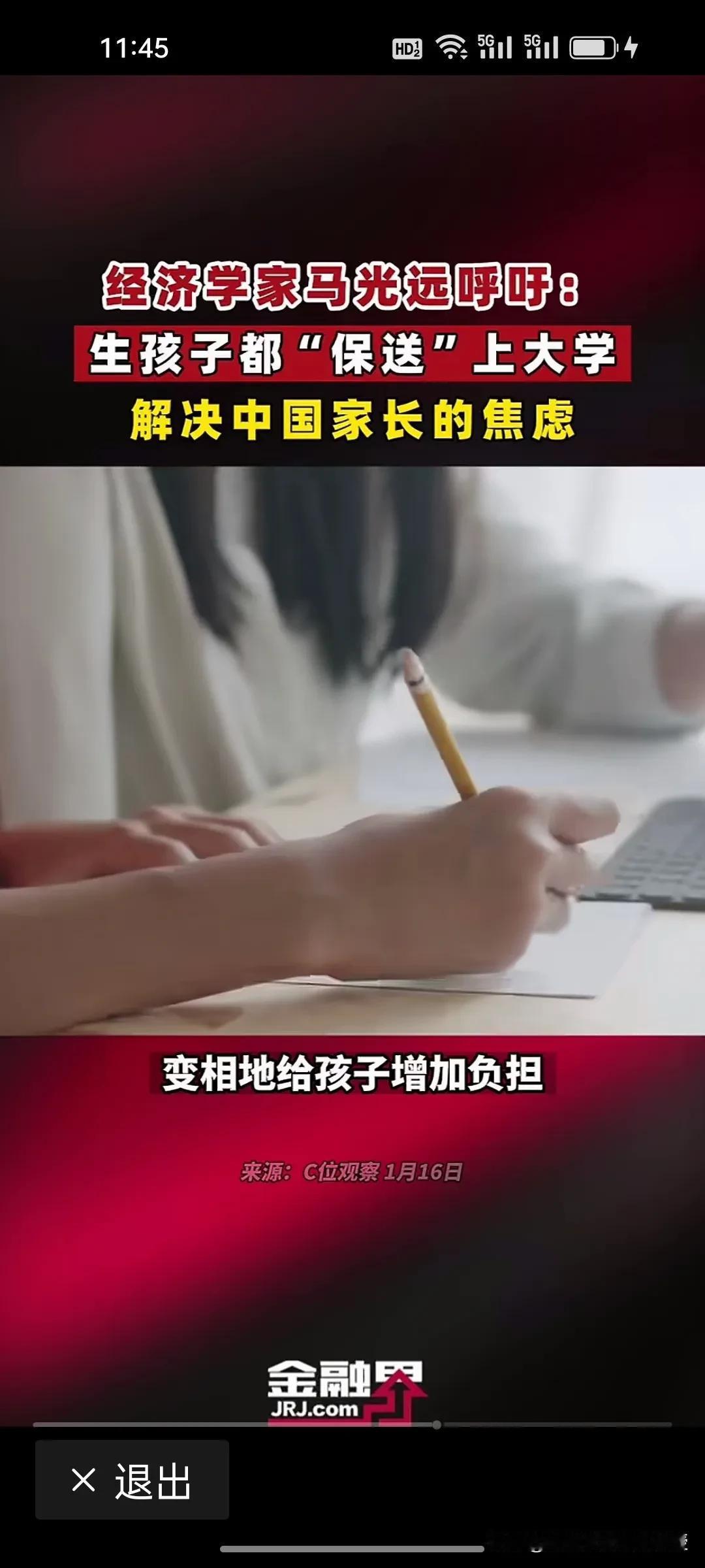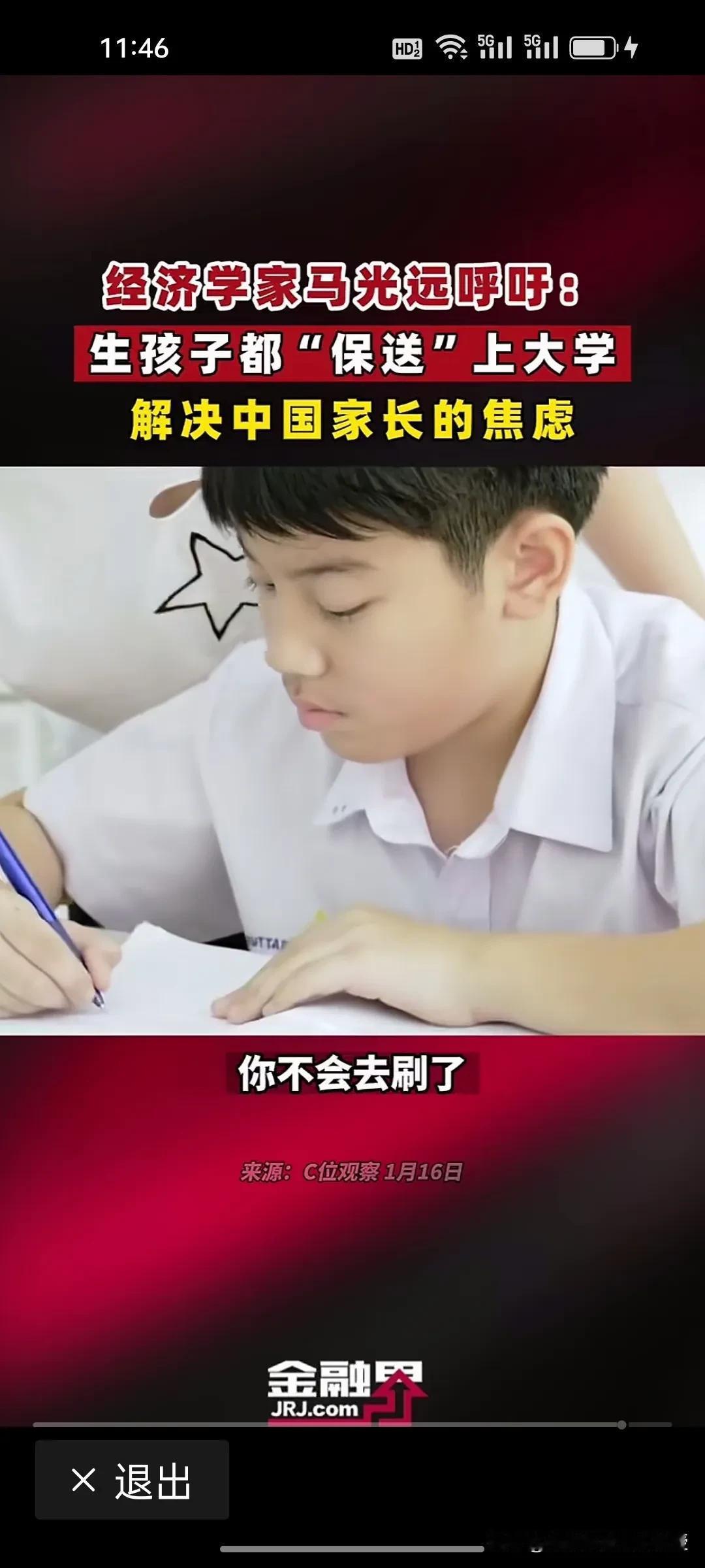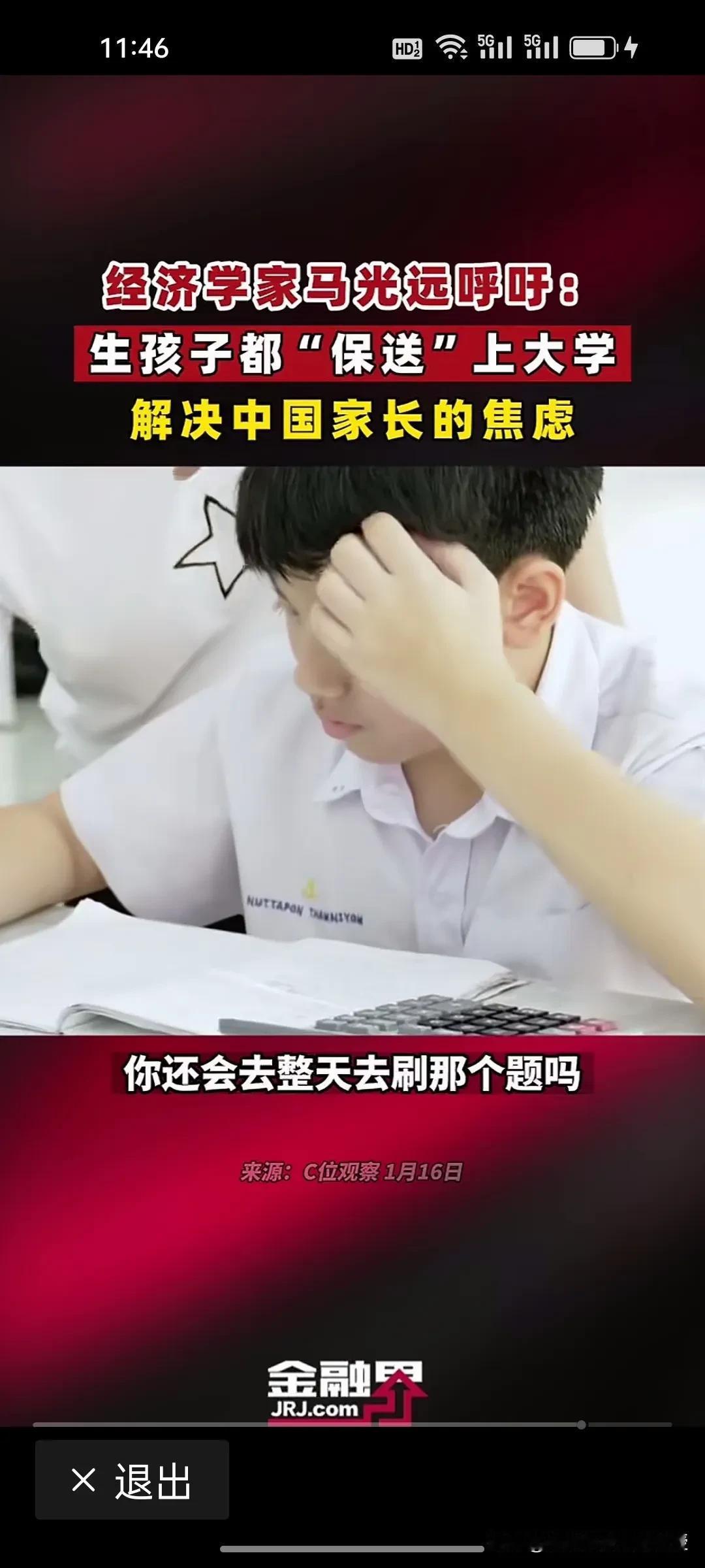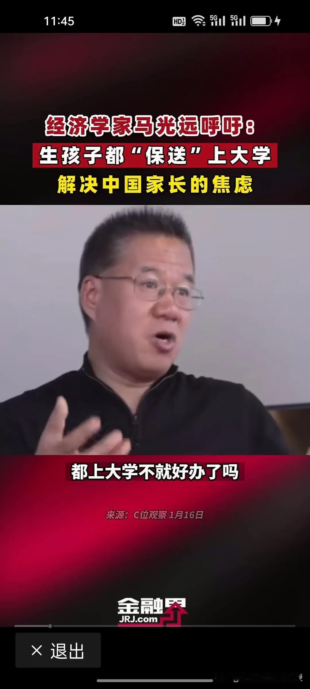 每个孩子都保送大学就能解决中国家庭焦虑? 马光远先生说“生孩子保送大学”就能解决家长焦虑,可是,现在家长的焦虑,从来不是“能不能上大学”,而是“上了大学能不能找到好工作”。如果孩子没有扎实的学习能力和真才实学,就算“保送”进大学,也可能混到毕业就失业。 现在的芯片半导体,人工智能等等行业,哪一个不需要过硬的知识储备呢?保送大学就能解决科技卡脖子问题吗? 高考的核心不是“筛选”,而是给普通家庭的孩子提供一条最公平的上升通道。如果取消选拔、全员保送,不仅会让基础教育彻底躺平,更会让阶层固化愈演愈烈。没有扎实的人才基础,科技突破、产业升级更是无从谈起。 与其空谈“保送”,不如想想怎么让大学教育更贴合就业需求,让每个努力的孩子都能拥有真正的竞争力,找到一份专业对口的好工作。
